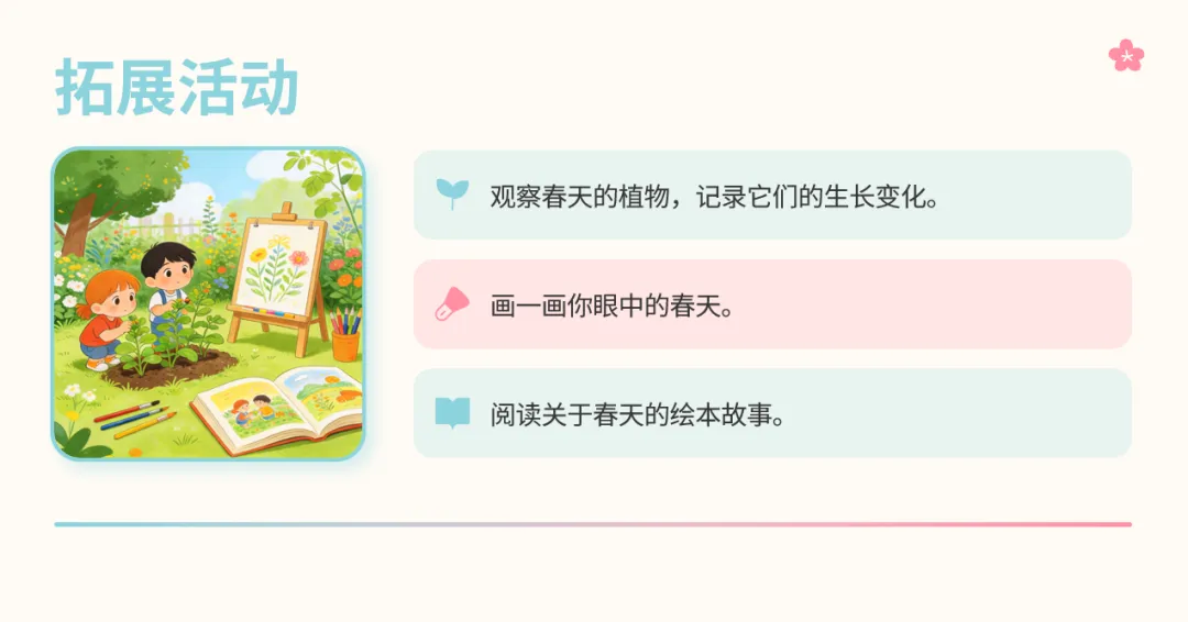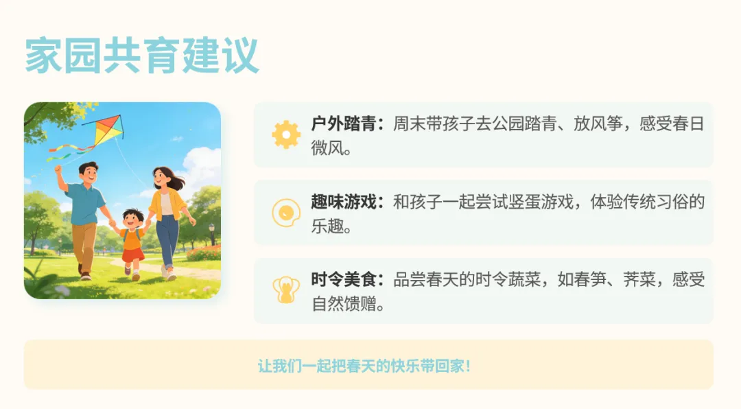 活动延伸:布置课后拓展任务,如和家长一起去公园放风筝、观察春天的植物、画一画春天等,并鼓励幼儿将自己的发现和作品带回幼儿园分享。