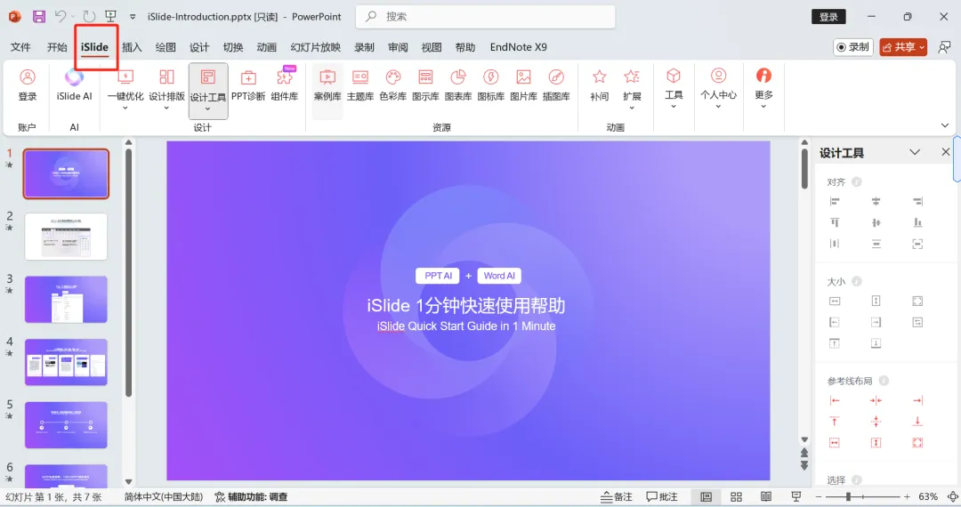 对于需要频繁进行科研汇报、论文答辩或学术展示的研究者而言,PPT的制作效率与视觉效果往往直接影响表达效果。iSlide作为一款基于PowerPoint的功能增强插件,能够帮助用户快速完成排版与美化工作,让复杂的设计变得简单高效。iSlide集成了多种实用设计与排版功能,内置38项设计辅助工具,涵盖统一字体、智能参考线、色彩搭配等常用操作。同时,软件配备8大在线资源库,提供模板、图标、图表、图片等多类素材,总量超过30万套专业PPT模板与素材,可满足不同场景下的设计需求。