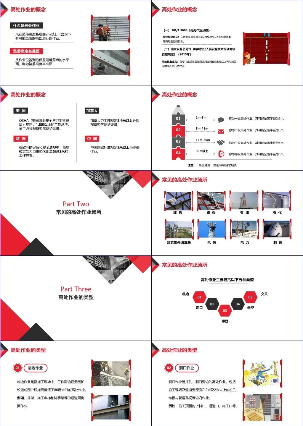 该文档《高处作业安全培训》是一份系统全面的安全教育材料,旨在提升从业人员对高处作业风险的认知与防范能力。全文围绕“高处作业”的定义展开,明确指出凡在坠落高度基准面2米及以上、有可能坠落的场所进行的作业均属高处作业,并对比了中国(2米)、美国(1.8米)、欧洲(2米)和加拿大(2.4米)等国家地区的标准差异。