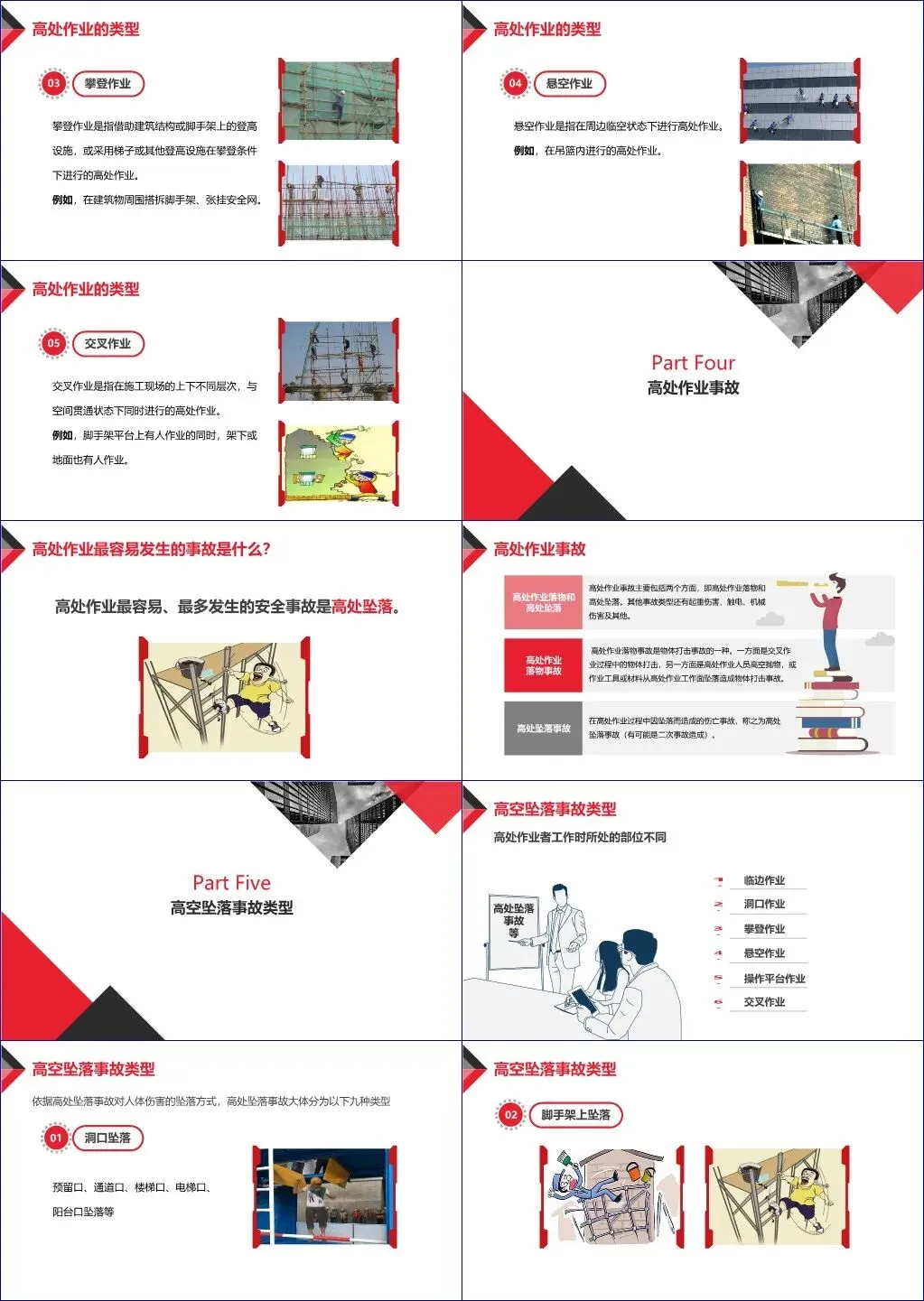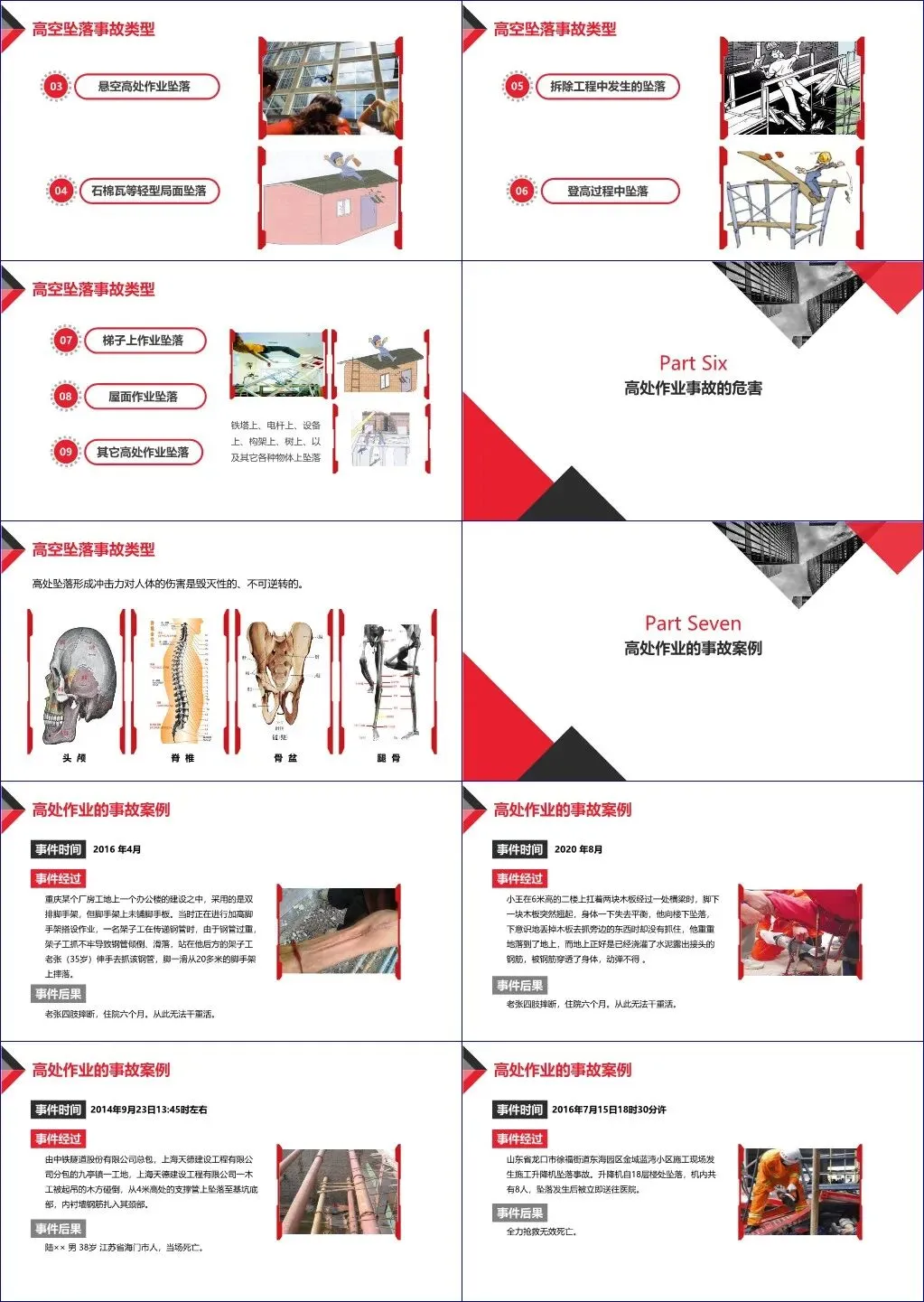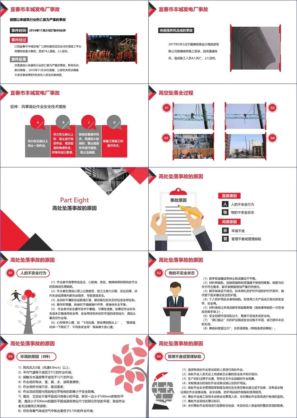 在事故分析部分,强调高处坠落是高处作业中最常见且最致命的事故类型,同时伴随高处作业落物引发的物体打击风险。通过多个真实案例(如丰城发电厂74人死亡特大事故、脚手架坠落致残事件等),直观揭示了违章操作、防护缺失、管理漏洞带来的惨痛后果。