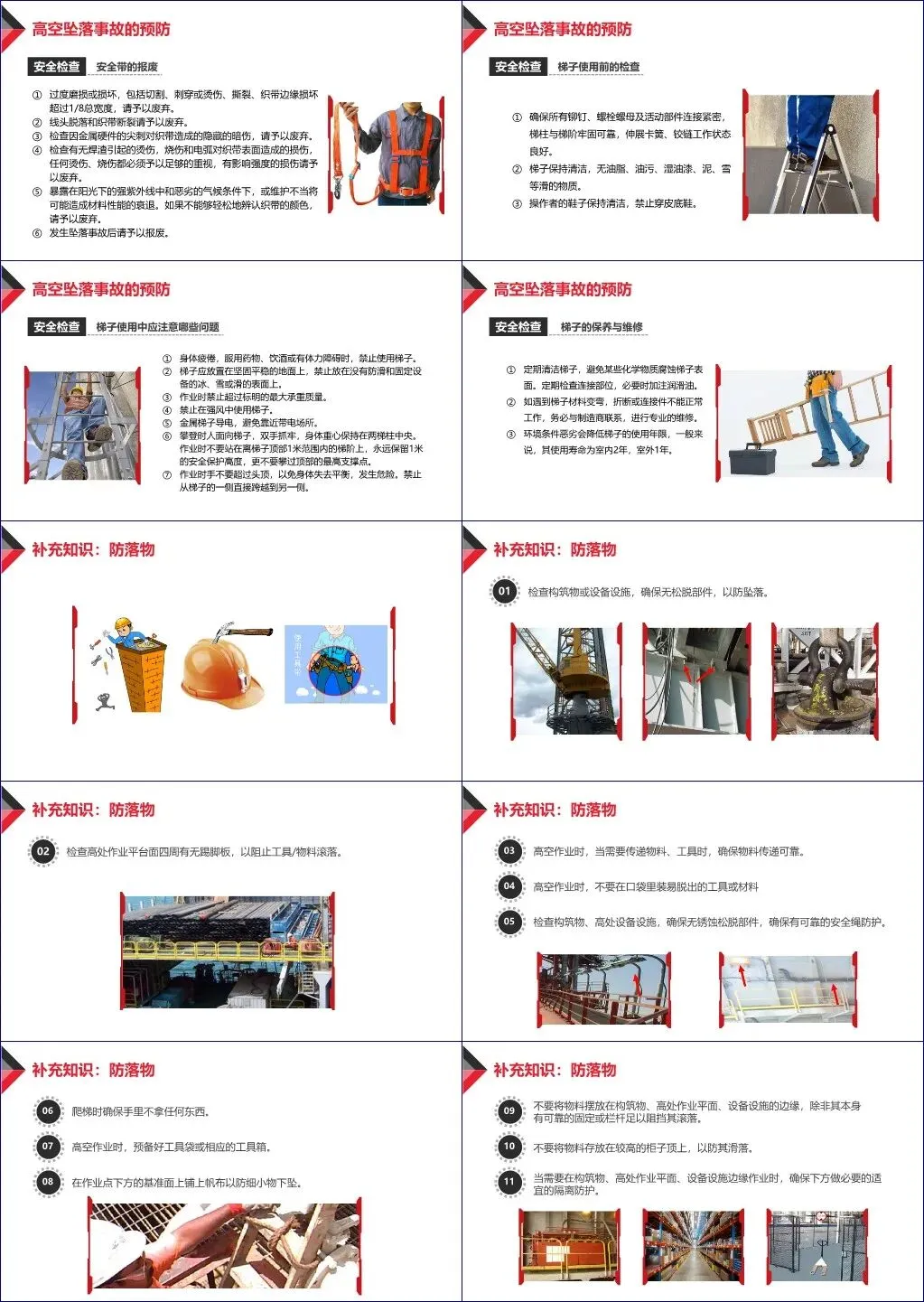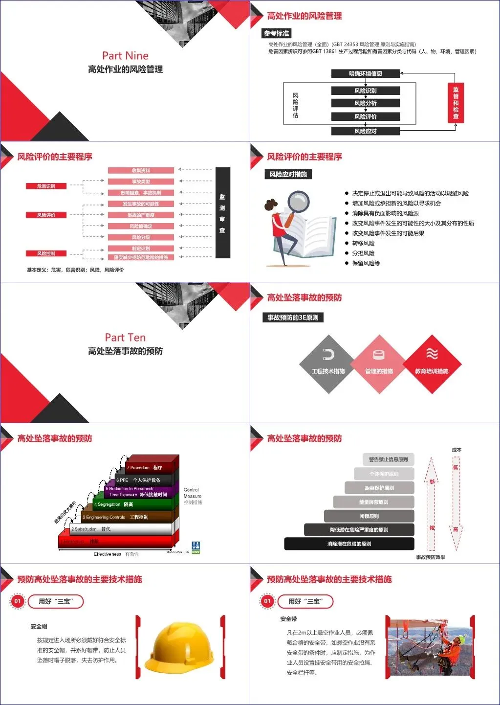 此外,还涵盖应急预案制定、个人防护装备检查、梯子安全使用规范及防落物管理等实操内容,倡导“工程技术措施、管理措施、教育培训”三位一体的3E事故预防原则。