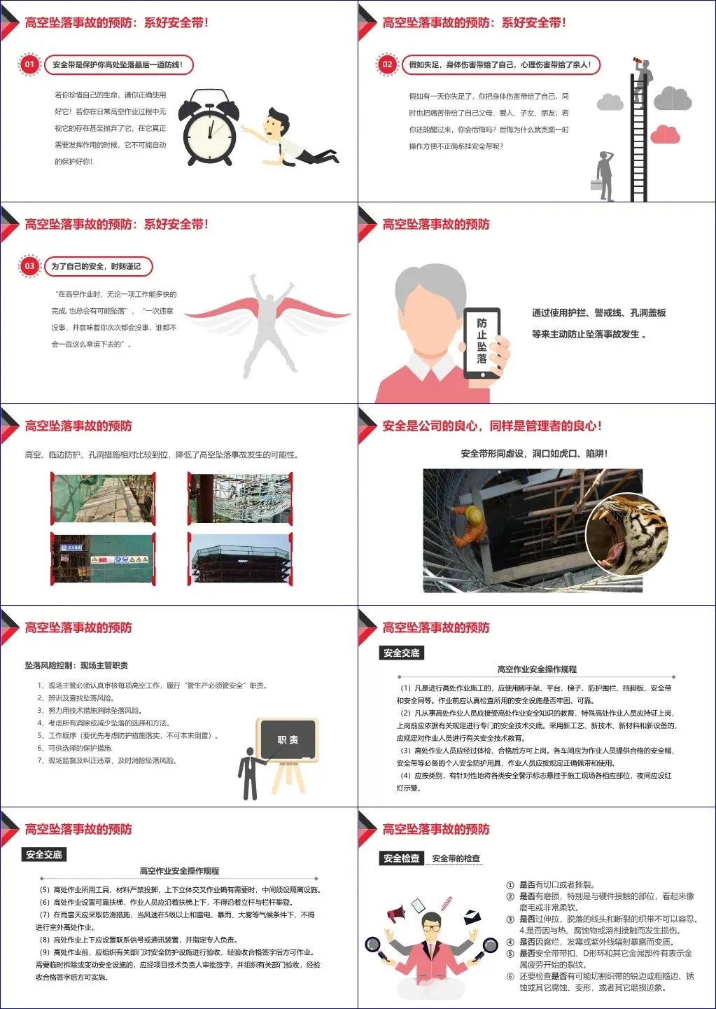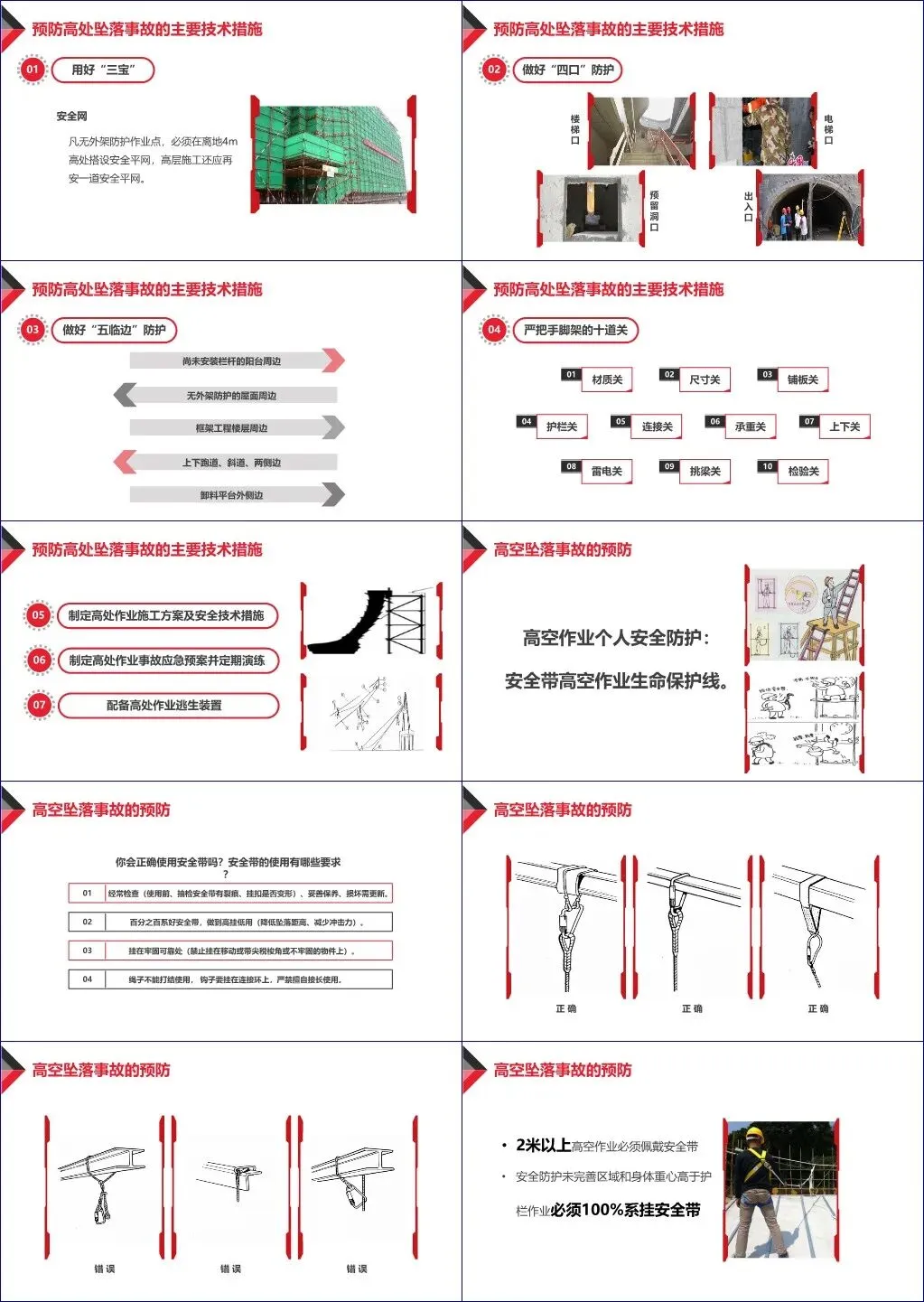 针对上述风险,文档提出系统的风险管理流程,并重点阐述预防措施,核心包括“三宝”(安全帽、安全带、安全网)、“四口”(楼梯口、电梯口、预留洞口、出入口)、“五临边”防护,以及脚手架“十道关”控制。特别强调安全带的正确使用——必须高挂低用、挂在牢固构件上、禁止打结或接长,并指出其作为“最后一道生命防线”的关键作用。