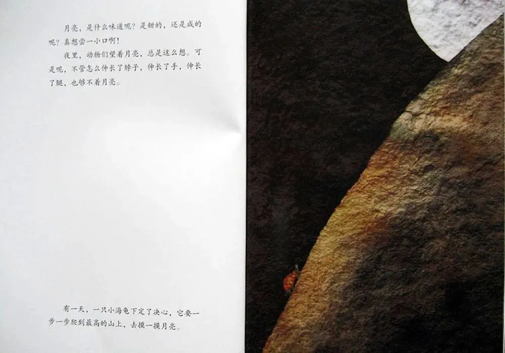有一天,一只小海龟下定了决心,它要一步一步爬到最高的山上,去摸一摸月亮。