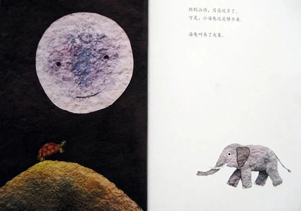 爬到山顶,月亮近多了。可是,小海龟还是够不着。海龟叫来了大象。