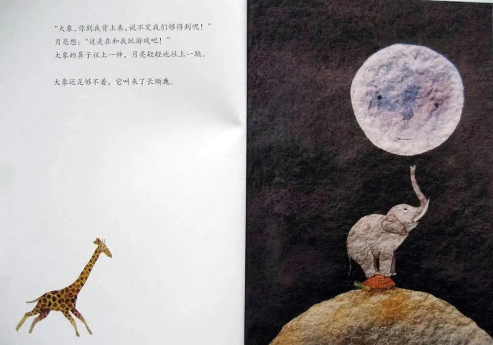 “大象,你到我背上来,说不定我们够得到呢!”月亮想:”这是在和我玩游戏吧!“