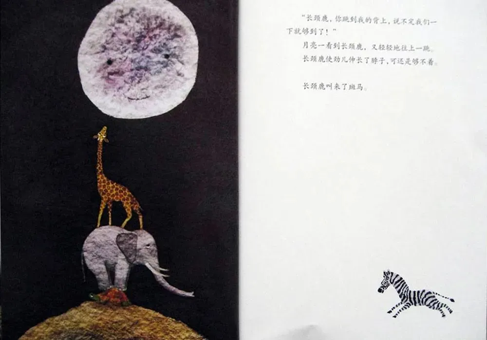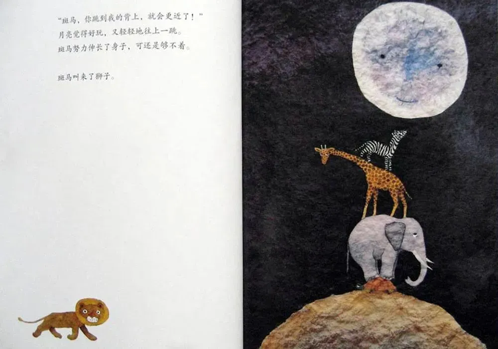 夜里,动物们望着月亮,总是这么想。可是呢,不管怎么伸长了脖子,伸长了手,伸长了腿,也够不着月亮。
