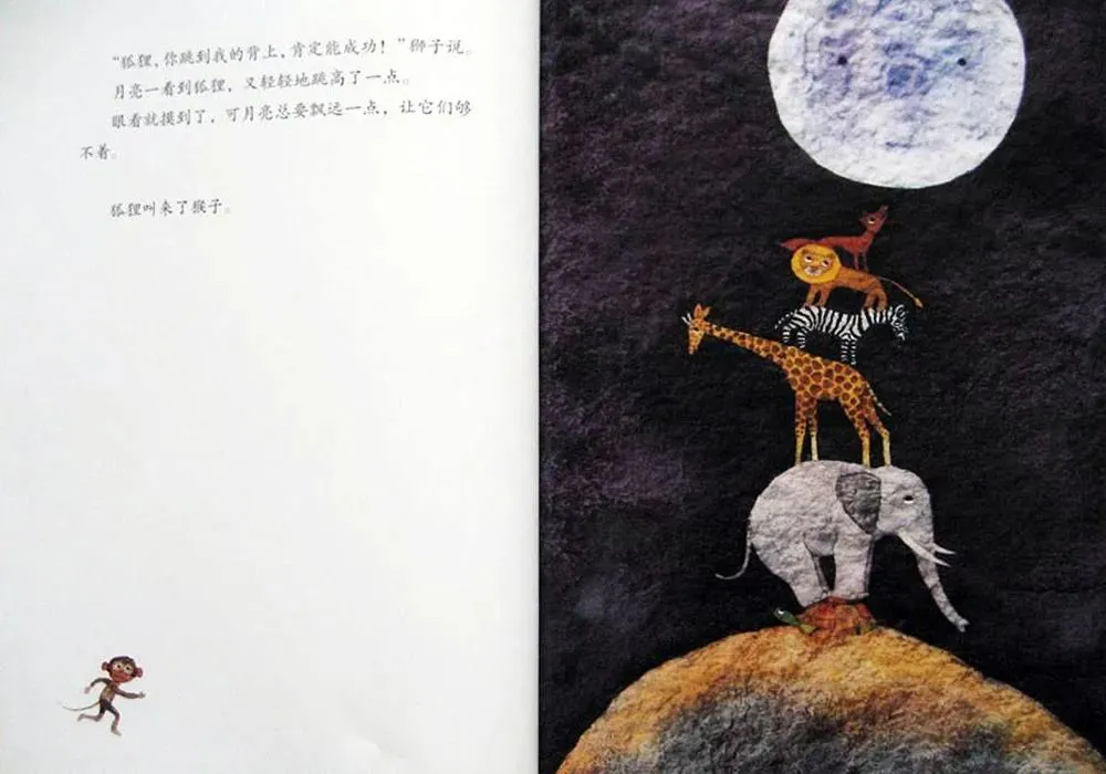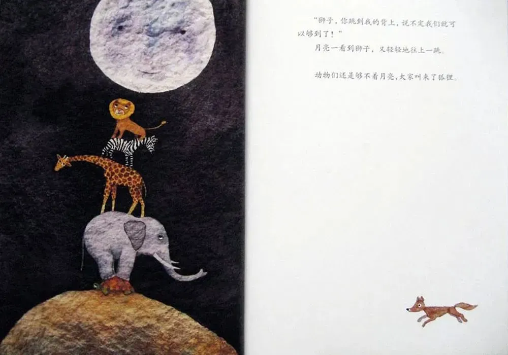 月亮一看到狮子,又轻轻地往上一跳。动物们还是够不着月亮,大家叫来了狐狸。
