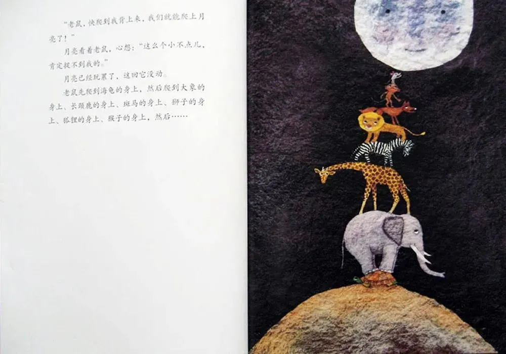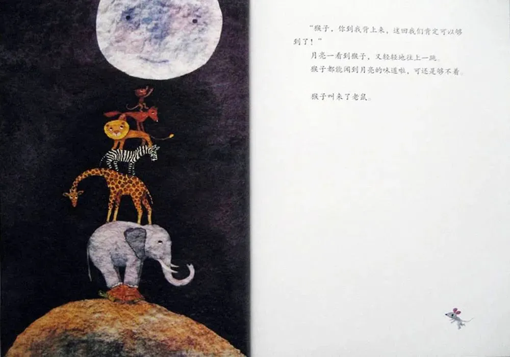 “老鼠,快爬到我背上来,我们就能爬上月亮了。”