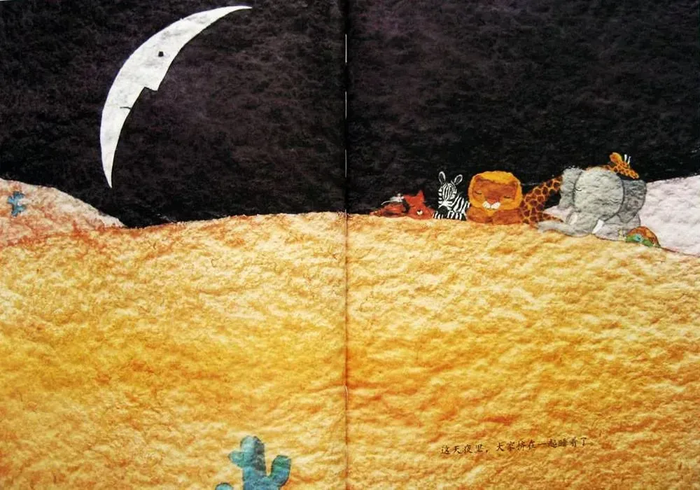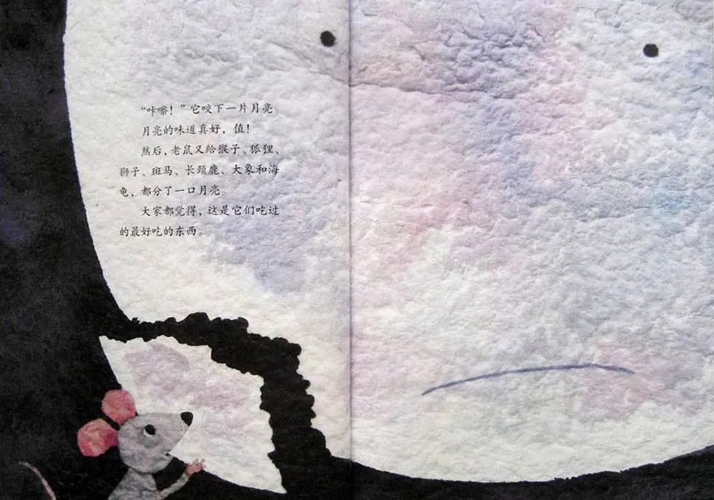 “咔嚓!”它咬下一片月亮。月亮的味道真好,值!然后,老鼠给猴子、狐狸、狮子、斑马、长颈鹿、大象和海龟,都分了一口月亮。大家都觉得,这是它们吃过的最好吃的东西。