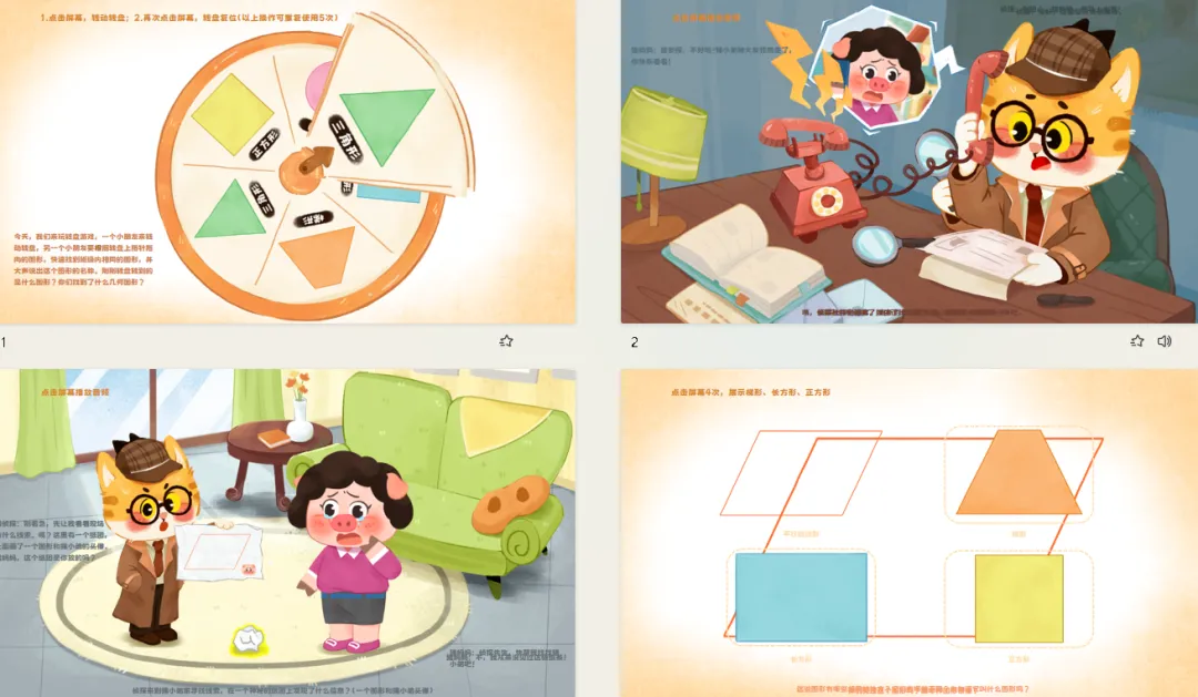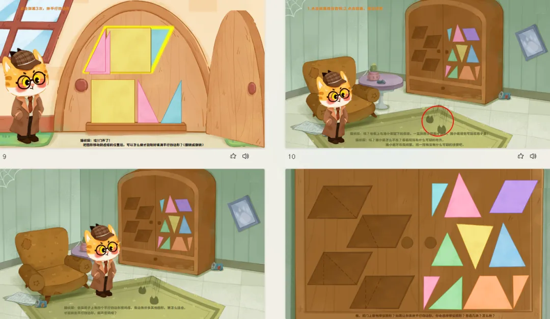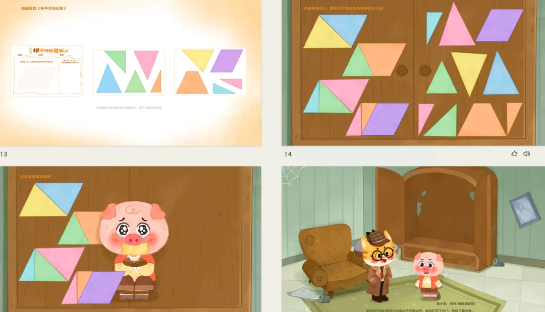 1.播放音频及图片,鼓励幼儿找平行四边形,发现新线索。