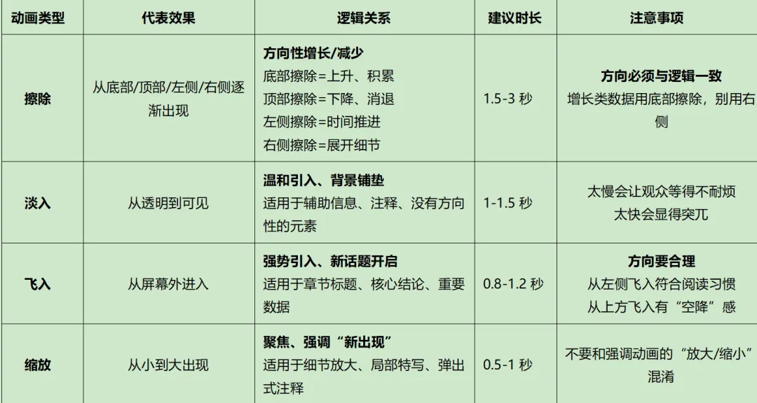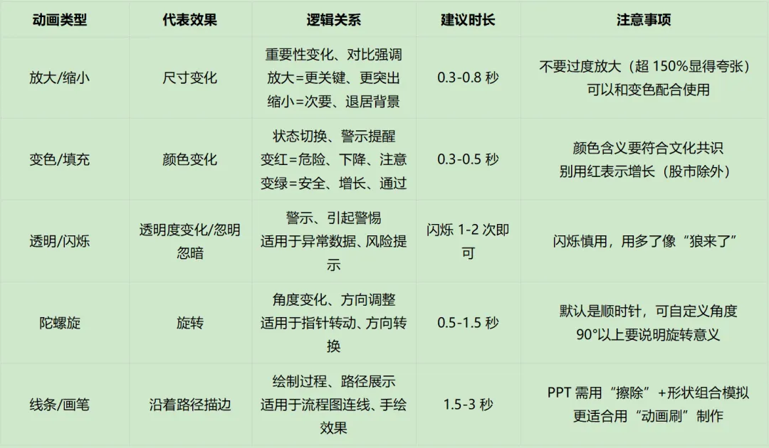 我总结了部分入场和强调,日常工作中常用的PPT动画逻辑对照表,建议时间是找小d给的时间,只能参考,要根据实际情况用。