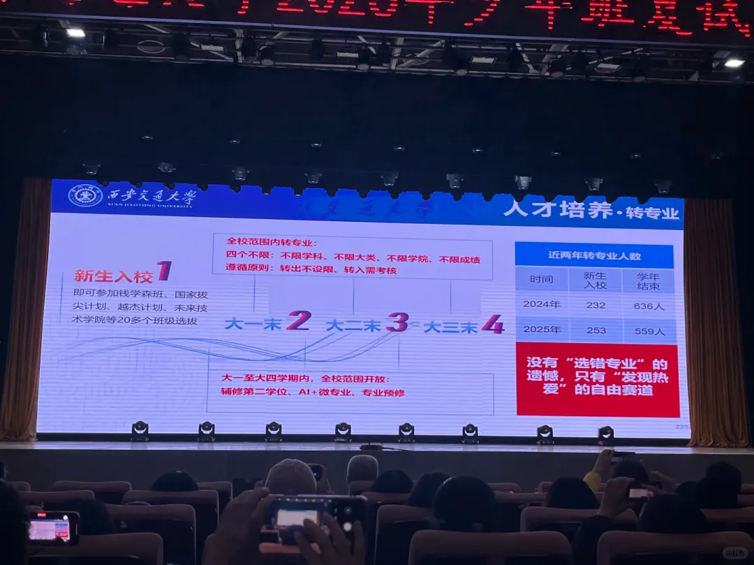 西安交大实行全校范围内转专业政策,最引人注目的是 “四个不限”:不限学科、不限大类、不限学院、不限成绩。转专业遵循 “转出不设限、转入需考核” 的原则,给学生充分的探索空间。