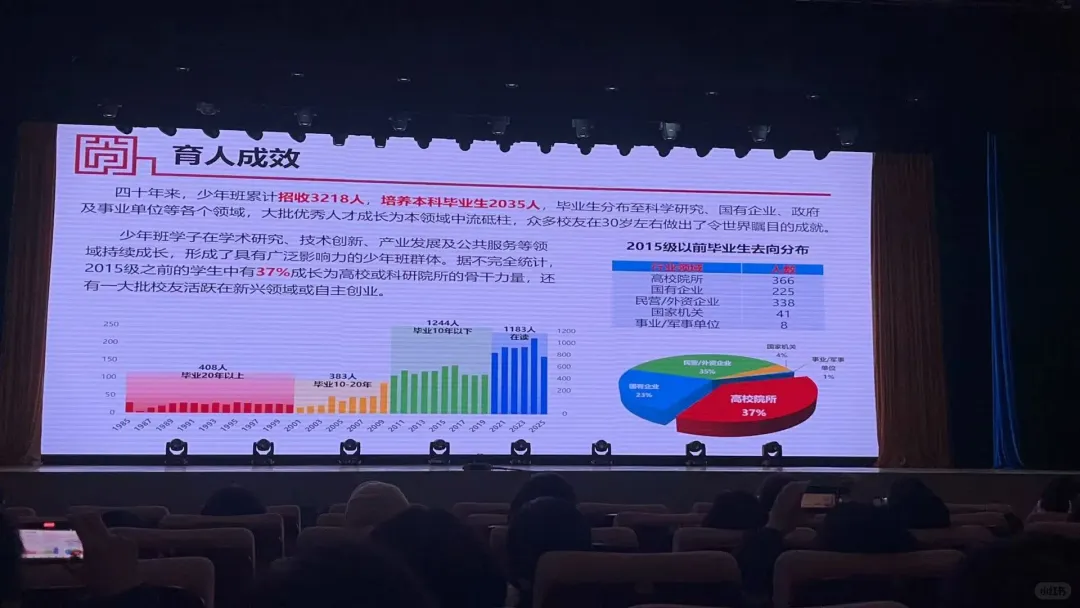 据不完全统计,2015级以前的少年班毕业生中,37%成长为高校或科研院所的骨干力量,分布至高校院所、国有企业、民营企业、国家机关等各个领域。毕业10-20年校友383人,毕业20年以上408人,大批校友在30岁左右便做出令世界瞩目的成就。
