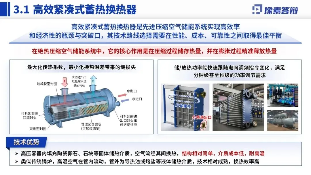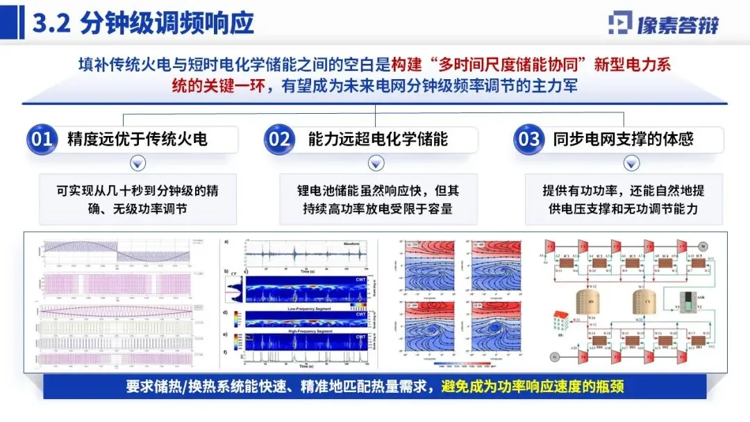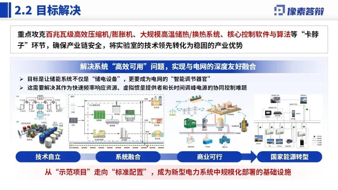 2.核心创新与技术内容:一是研发高效紧凑式蓄热换热器,适配电网调频的快速功率调节需求;二是实现分钟级调频响应,精度优于火电、持续能力远超电化学储能,还能提供电压和无功调节;三是通过多温度区段蓄热、宽工况气动设计等全链条技术创新提升系统效率,结合国际应用成果推进百兆瓦级项目落地,系统效率目标超70%。