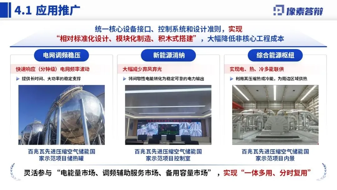 3.应用推广与效益:采用标准化设计、模块化制造模式降低成本,系统可灵活参与多电力市场,实现电网调频、新能源消纳、多能联供等多元应用;经济上单位投资随规模提升显著下降,平准化度电成本低于主流电化学储能,热能复用率≥98%、循环效率提升20个百分点;社会层面将弃风弃光率降至1%以下,年多消纳绿电3亿 kWh,减少化石燃料消耗和碳排放,为电网安全稳定运行提供支撑。