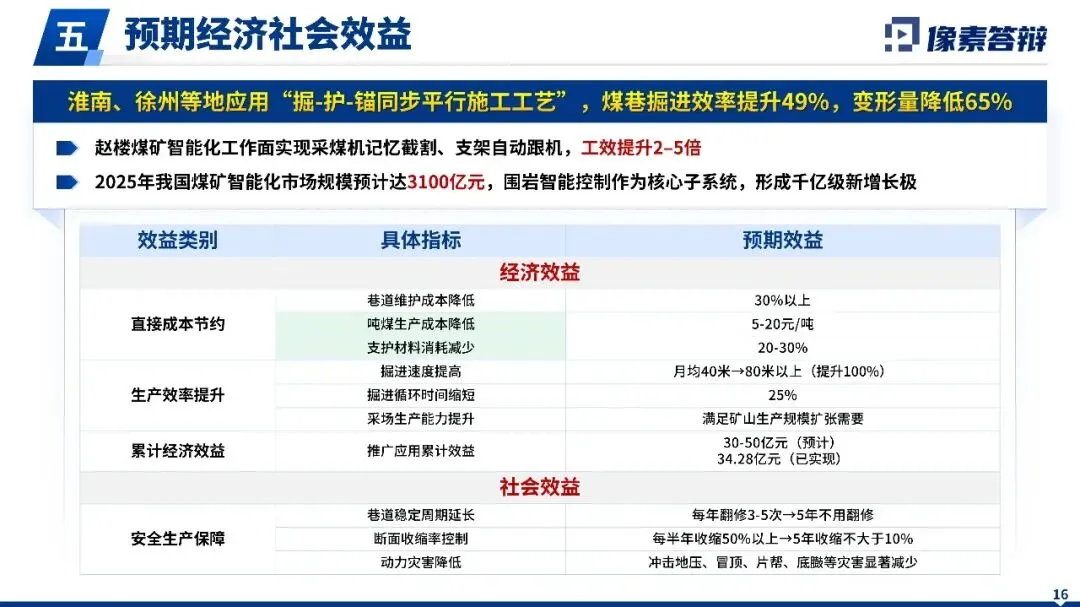 预计巷道维护成本降30%以上,掘进效率翻倍;针对地质不确定性等风险,采用四维感知、联邦学习等技术保障。