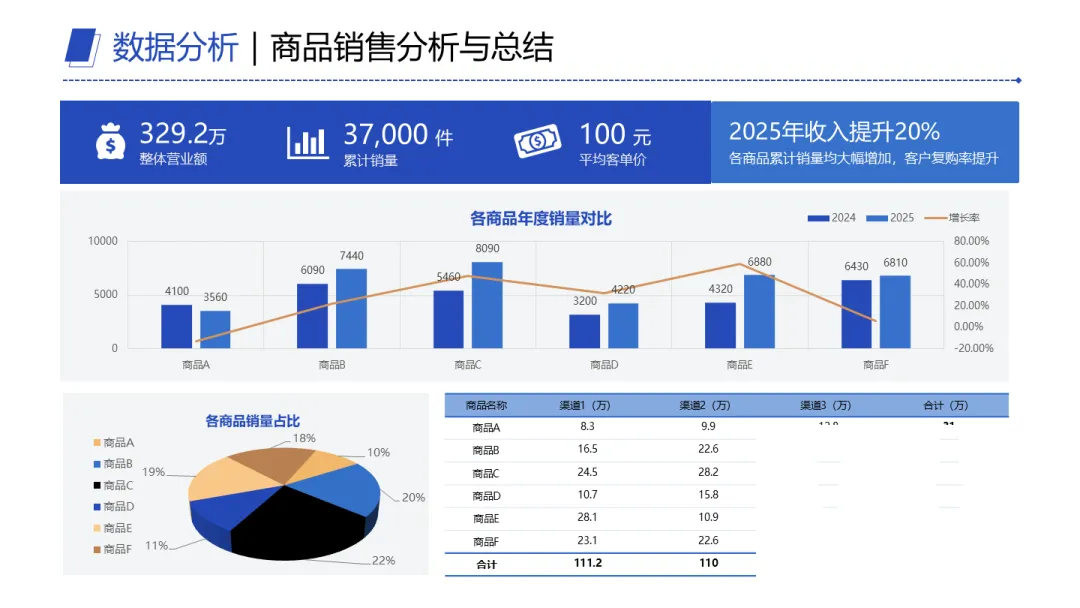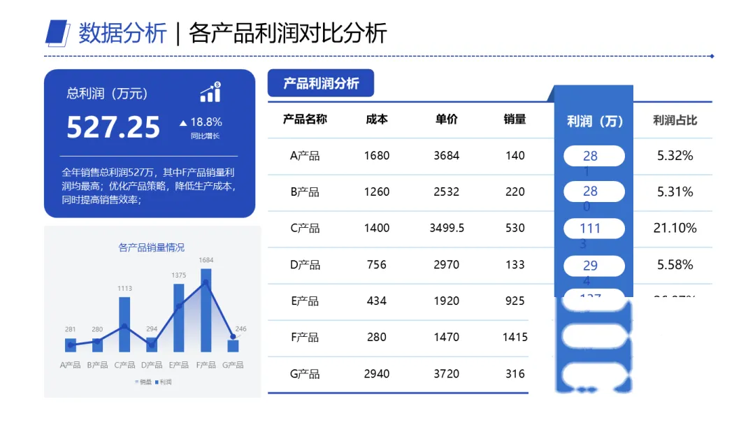利润分析也是一样。全年总利润527万,同比增长18.8%,看着不错。但拆开看后,F产品贡献明显更高,别的产品利润甚至只有246万。那结论就很直接了:资源该往高利润产品上倾斜。不是拍脑袋,是数据逼着你得出这个判断。