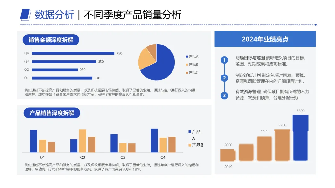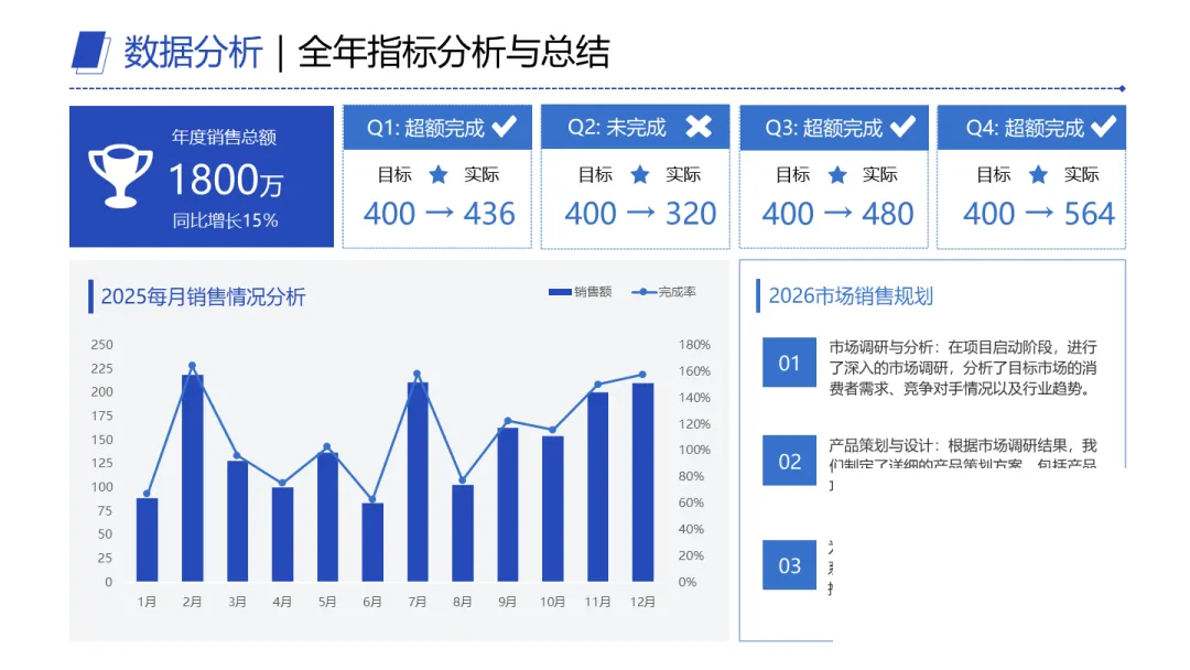有效的做法很简单:先摆核心指标。比如年度销售情况,不用长篇解释,直接把Q1到Q4的完成进度放出来:Q1从400做到436,Q2掉到320,Q3拉到480,Q4冲到564。四个数字一对比,走势立刻出来了。