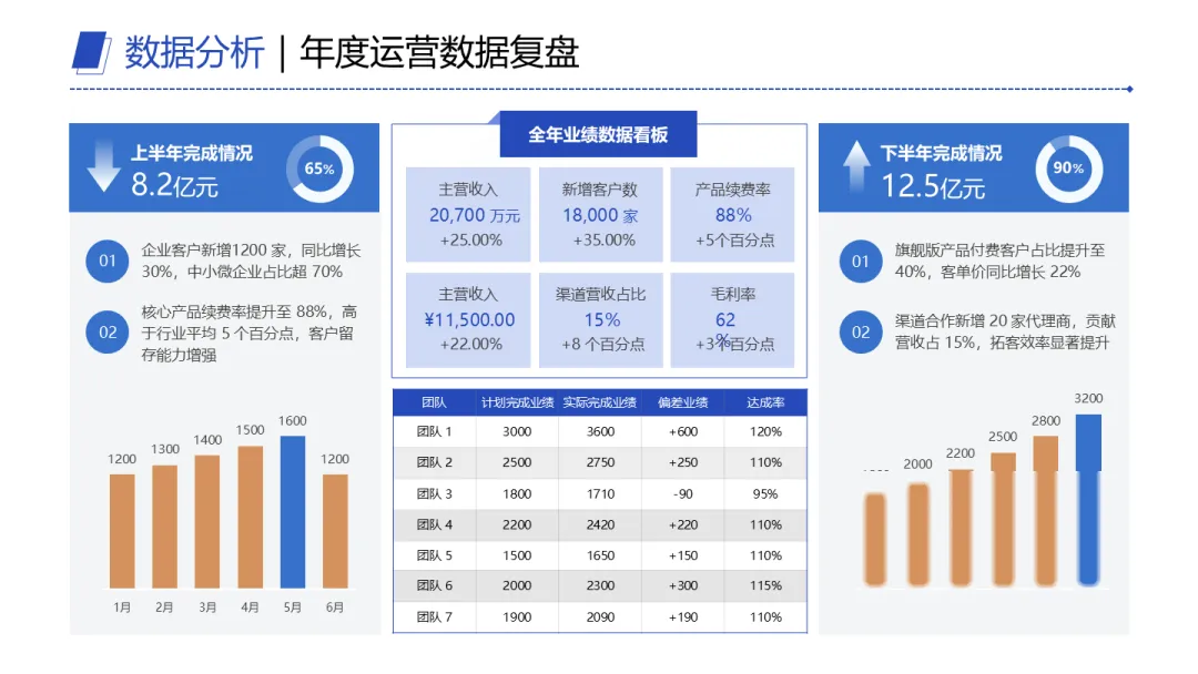 所以专业的数据汇报,一定有数据对比。主营收入20700万,后面要跟着+25%;新增客户18000家,要知道是+35%;续费率88%,还得说明高于行业平均5个百分点。没有比较,数字就只是数字。