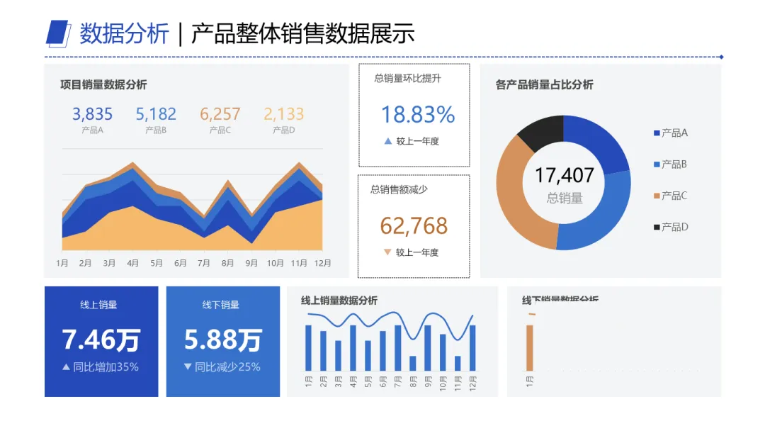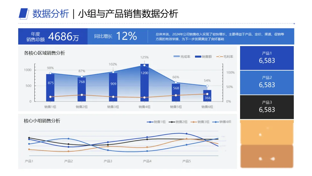 这是很多人最舍不得改的地方。总想一页装下所有信息,结果就是惨不忍睹——产品A、B、C、D,线上线下、销售额、增长率、完成率,全挤一起,看完脑子一片空白。