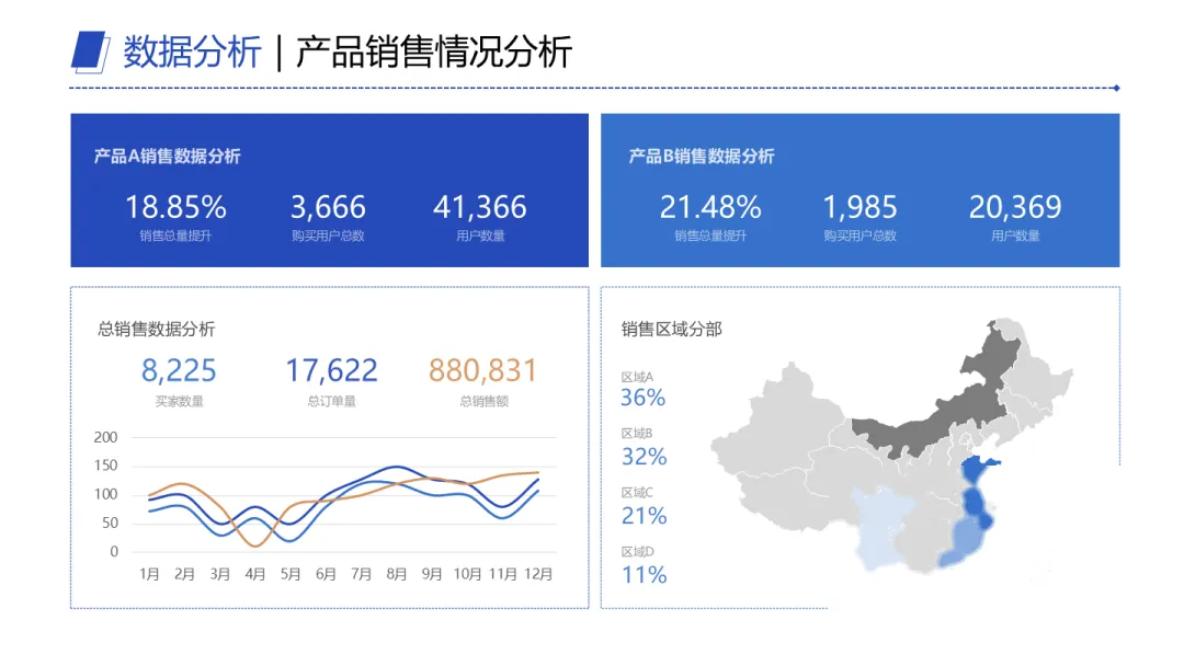 比如产品A和产品B的销售分析,图里只保留两件事:A销量提升18.85%,购买用户3666;B销量提升21.48%,购买用户20369。够了。信息少一点,反而记得住。