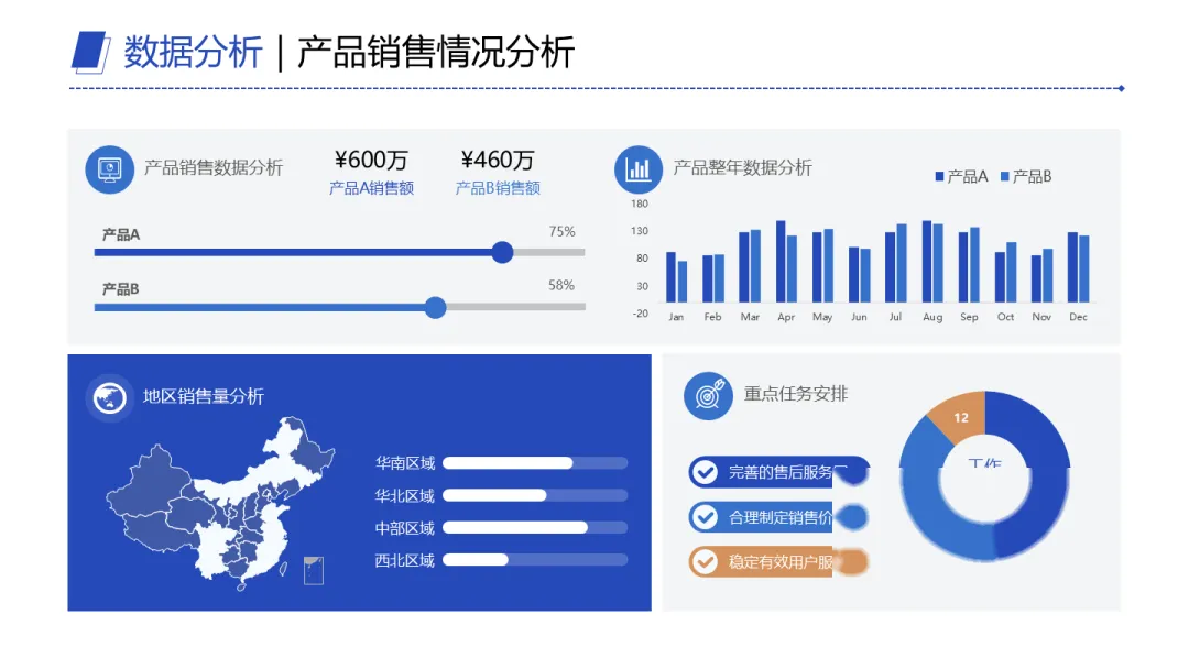 区域销售也一样。华南、华北、中部、西北,谁卖得强,谁适合主推什么产品,直接标清楚。这样做的本质,不只是美观,而是让业务解读更顺。看的人不用猜你想说什么。