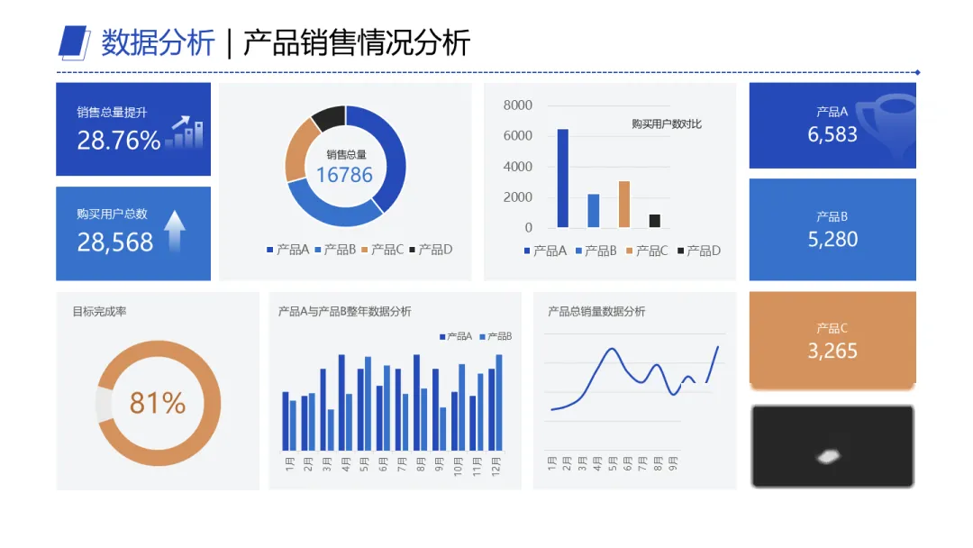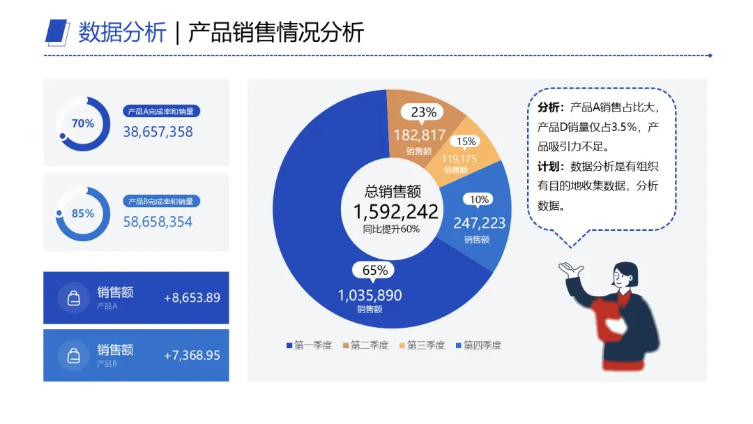 再比如产品销量占比里,A卖得多,D只占3.5%。那重点显然不是重复这个结果,而是追问:D为什么弱?是吸引力不够,还是策略失焦?接下来打算怎么优化?问题导向一出来,PPT就有力量了。