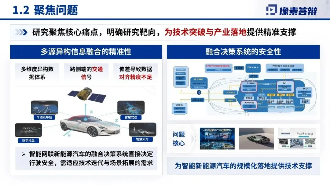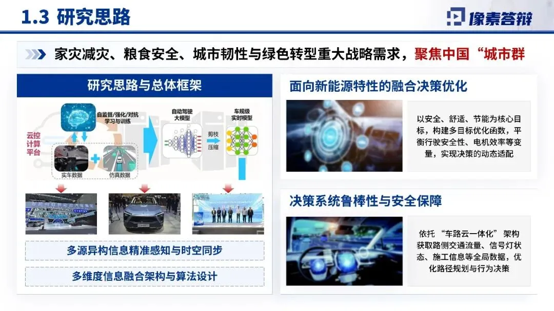 1.项目背景与研究思路针对国家重大需求,项目以“为智能新能源汽车规模化落地提供技术支撑”为核心目标,明确问题核心在于复杂场景下的信息融合与风险决策。研究思路围绕多源信息融合、能效优化与数据安全展开,旨在突破现有技术瓶颈,推动产业升级。