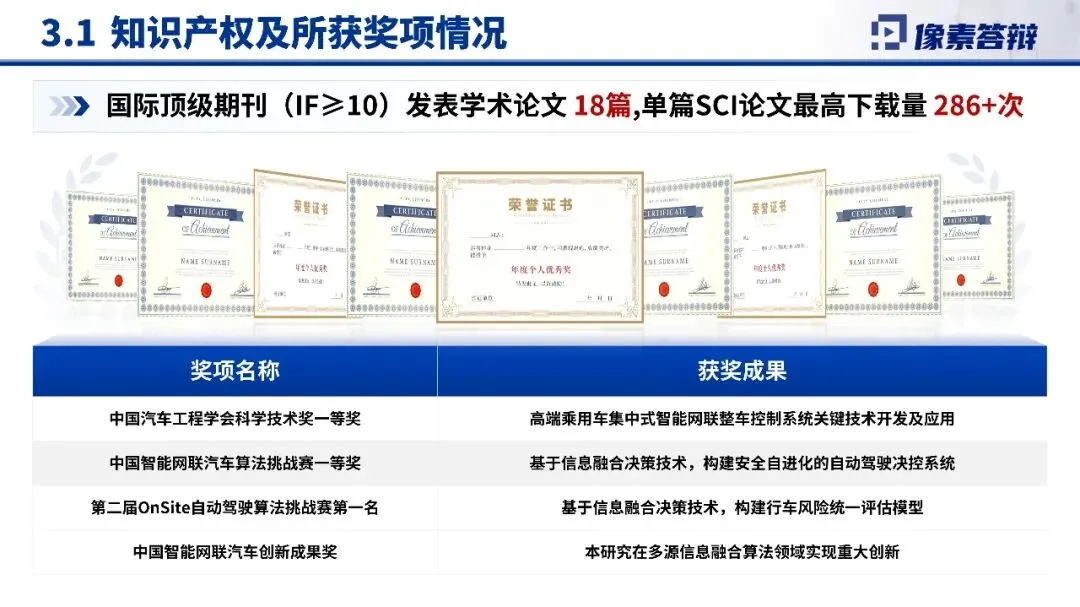 该PPT是科学技术奖的申报汇报材料,围绕智能新能源汽车的关键技术展开。项目面向国家重大需求,聚焦智能新能源汽车规模化落地的技术支撑问题,通过复杂场景信息融合、多模态数据决策系统及容错机制等创新技术,形成了一套完整的技术体系,并在产业应用中取得显著成效。