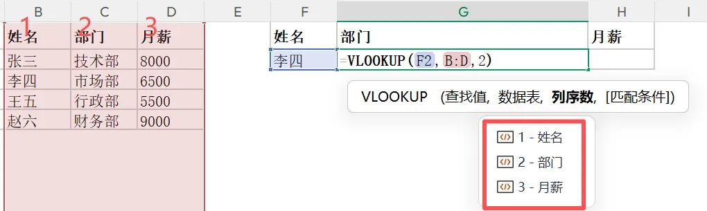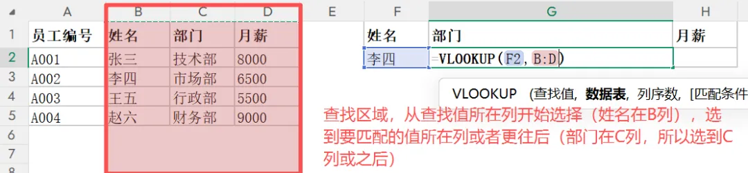 示例中可以将公式复制到月薪单元格,列序数直接改为3即可。小提醒:查找值(姓名)必须在查找区域的第一列(从B列开始选择),这是 VLOOKUP 的关键规则。