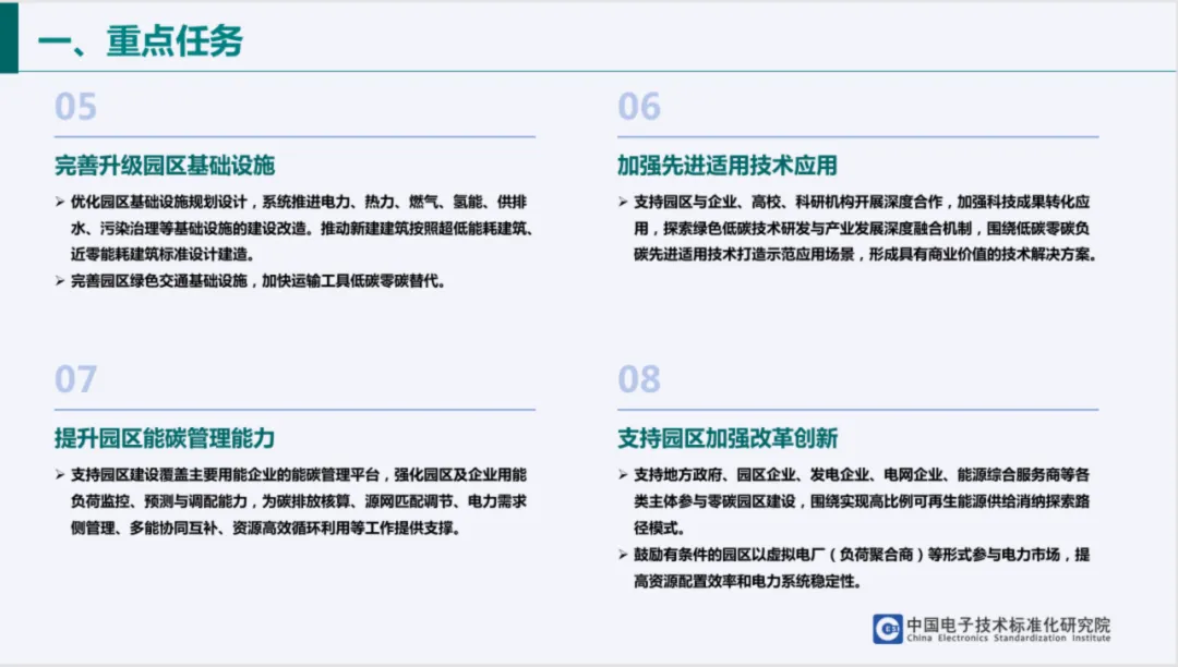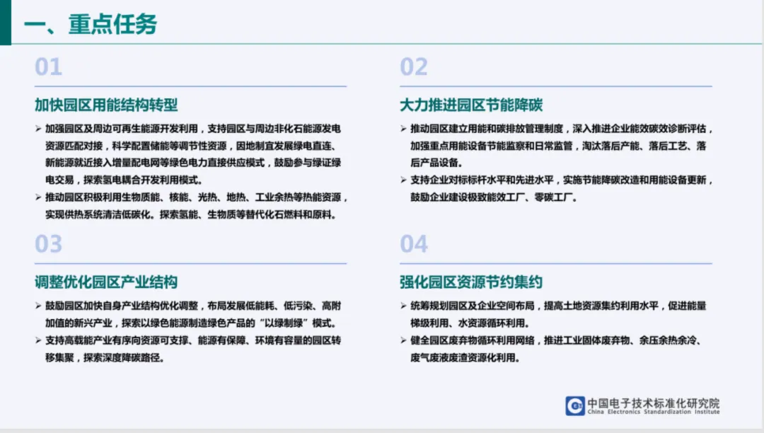 重点任务涵盖大力推进园区节能降碳,加快用能结构转型,加强可再生能源开发利用,支持绿电直连、新能源就近接入等模式;调整优化产业结构,布局低能耗、低污染、高附加值新兴产业;完善升级基础设施,推动新建建筑按超低能耗标准设计,并加强先进适用技术应用与能碳管理能力提升。
