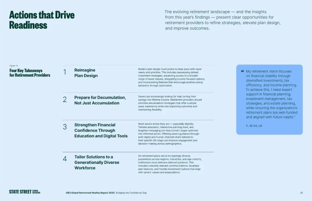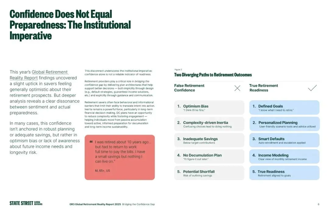 2.信心与准备的割裂:乐观情绪的背后,是实打实的准备缺口。很多储户的信心,源于对未来收入需求、长寿风险的不了解,而非科学的规划。报告中甚至有美国65岁以上受访者表示,退休10年因积蓄不足不得不重返全职工作,这一案例直接印证了“虚假信心”的隐患。