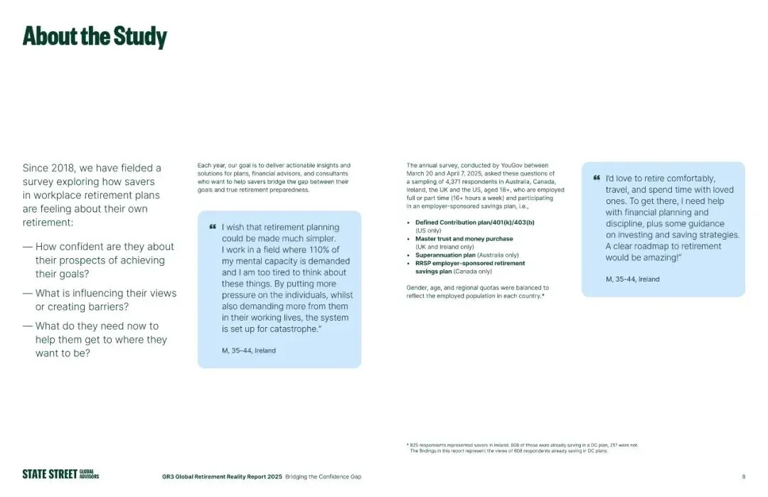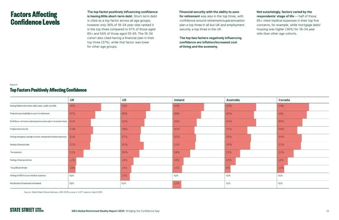 当下,全球养老格局正经历着前所未有的变革,老龄化加剧、经济波动、工作模式转变,都让退休规划成为每个人绕不开的话题。道富投顾(SSGA)发布的《2025年全球退休报告》,基于对澳、加、爱、英、美5国4371名职场养老计划参与者的调研,揭开了全球储户的退休信心与实际准备之间的核心矛盾。