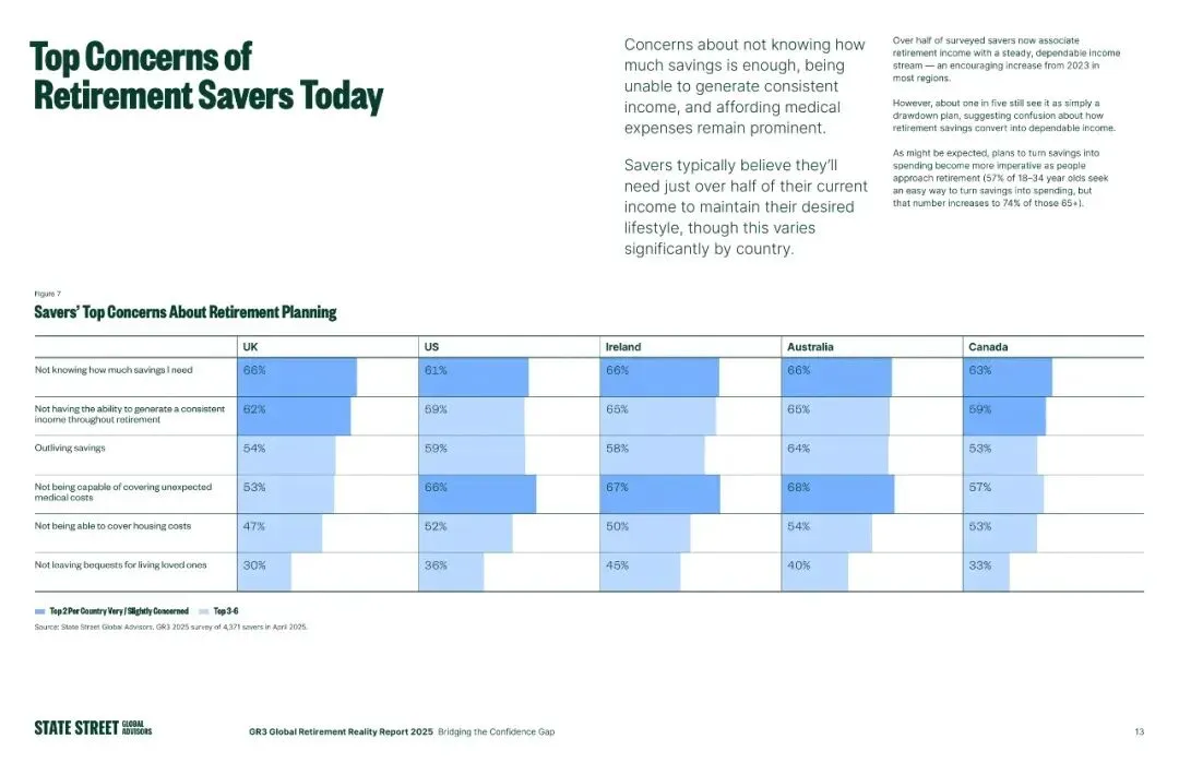 全球储户的退休焦虑高度趋同,首要痛点是“不知道需要多少储蓄才够养老”,英、美、爱等国该比例超60%;其次是“无法在退休后产生稳定收入”“担心耗尽积蓄”,此外,意外支出、医疗成本、住房成本也成为高频担忧,65岁以上群体对医疗支出的担忧尤为突出,18-34岁群体则更关注房贷和住房压力。