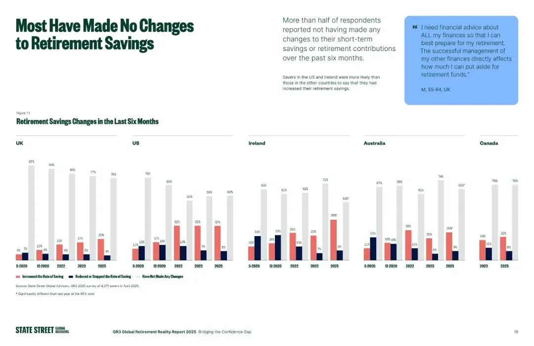 储户的养老行动普遍滞后于认知:超半数受访者过去6个月未对养老储蓄、短期储蓄做任何调整,仅有美国、爱尔兰储户相对更愿意增加养老储蓄;未来6个月,仅三成储户计划提高养老储蓄比例,远低于近四成计划增加短期储蓄的比例,更多人仍将短期财务需求放在优先位置,养老储蓄的行动力严重不足。
