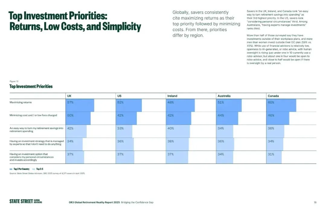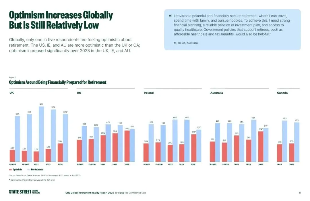 当下,全球养老格局正经历着前所未有的变革,老龄化加剧、经济波动、工作模式转变,都让退休规划成为每个人绕不开的话题。道富投顾(SSGA)发布的《2025年全球退休报告》,基于对澳、加、爱、英、美5国4371名职场养老计划参与者的调研,揭开了全球储户的退休信心与实际准备之间的核心矛盾。