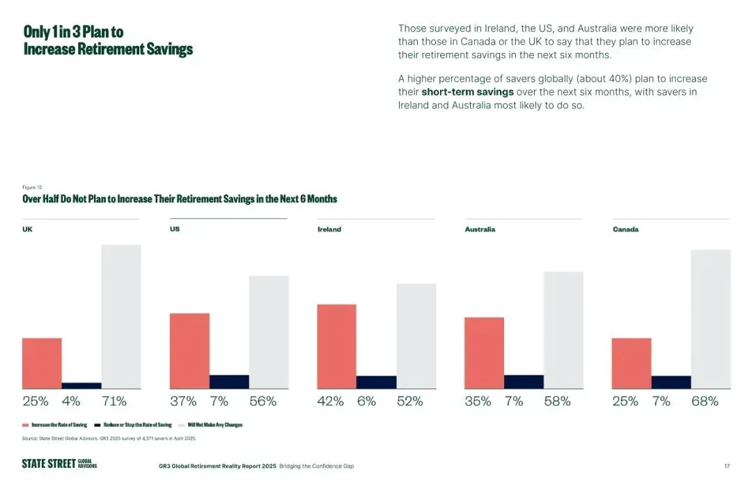 储户的养老行动普遍滞后于认知:超半数受访者过去6个月未对养老储蓄、短期储蓄做任何调整,仅有美国、爱尔兰储户相对更愿意增加养老储蓄;未来6个月,仅三成储户计划提高养老储蓄比例,远低于近四成计划增加短期储蓄的比例,更多人仍将短期财务需求放在优先位置,养老储蓄的行动力严重不足。