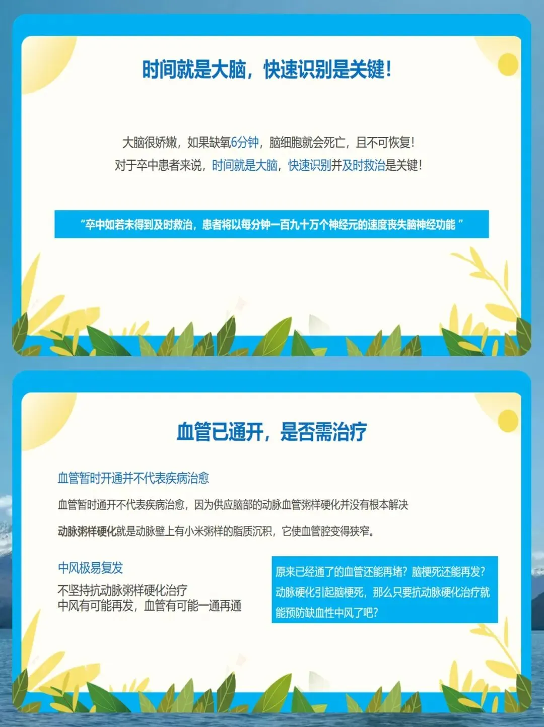 很多朋友会问,血管通了是不是就治好了?答案是否定的。血管暂时开通并不代表疾病治愈,因为导致中风的动脉硬化根本问题还在。如果不坚持治疗,中风极易复发。数据显示,经抢救治疗的存活者,在5年内有20%到47%的复发率。而且,复发的病情往往比第一次更凶险,死亡率是首次的2.67倍。