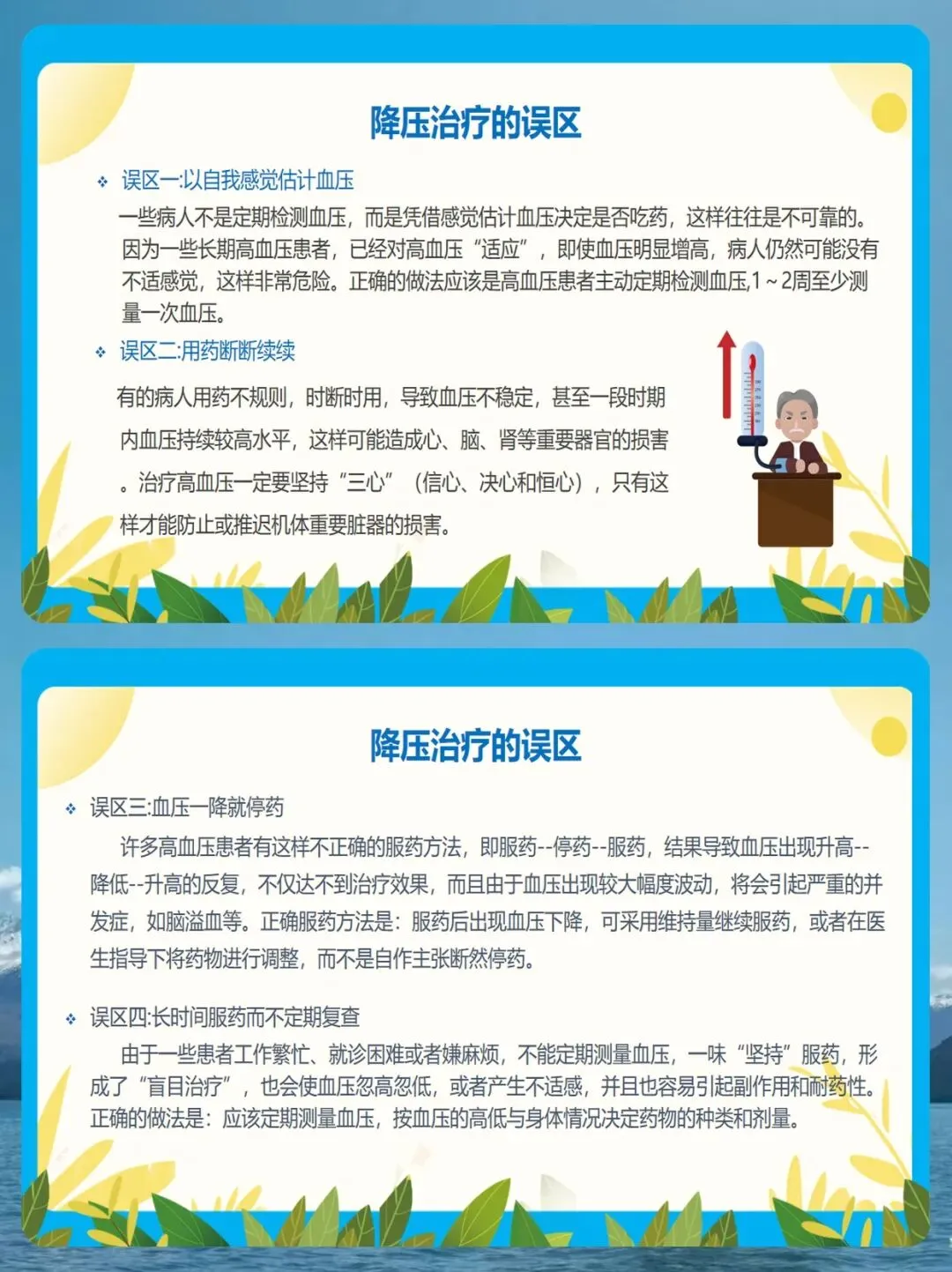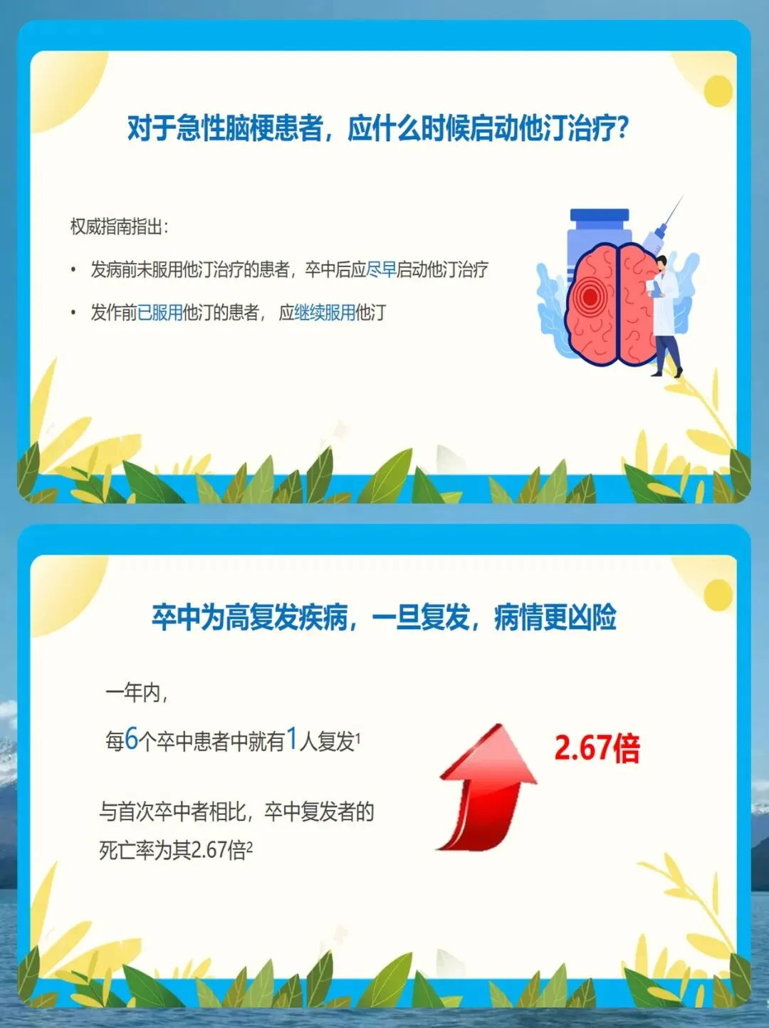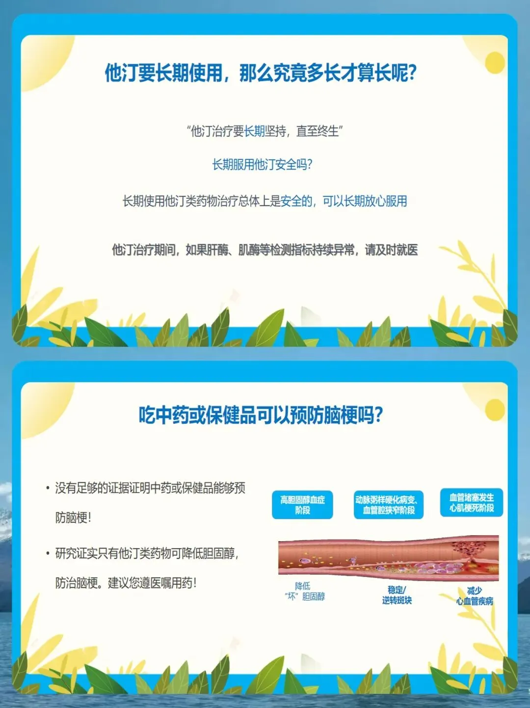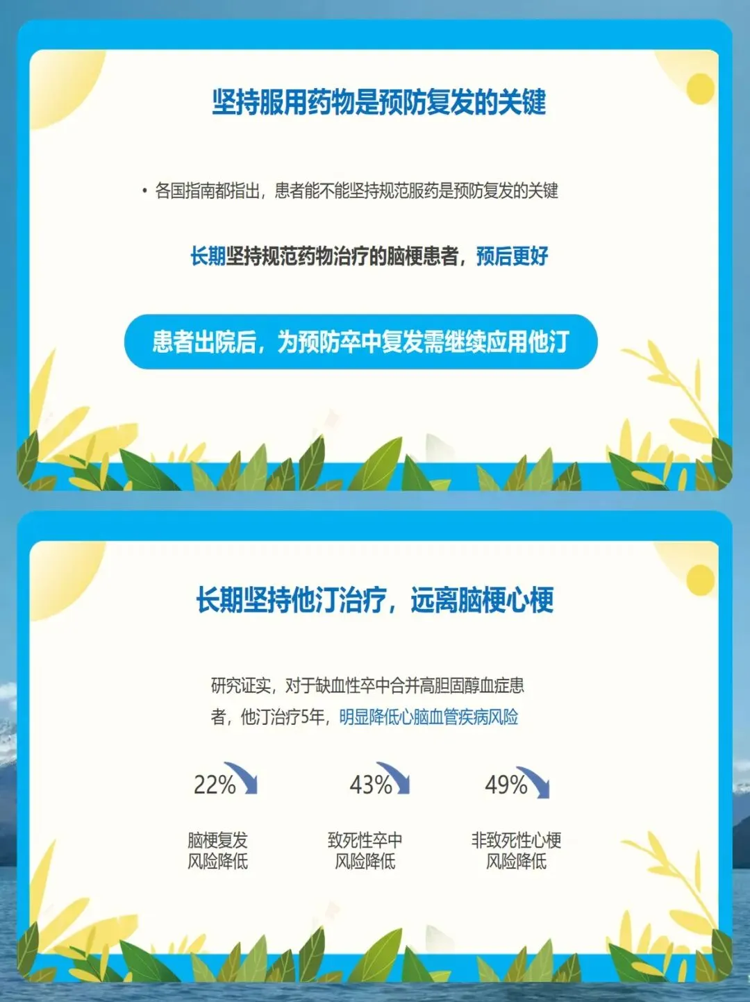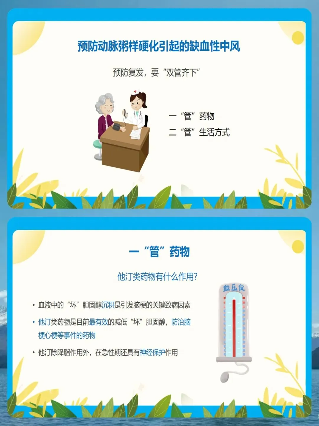 研究证实,长期坚持他汀治疗,能显著降低脑梗复发风险、致死性卒中风险和心梗风险。大家放心,长期使用他汀总体上是安全的,只有极少数人会出现肝酶或肌酶异常,只要定期复查即可。 同时,对于高血压患者,降压药也必须长期、规律服用。这里我要纠正几个常见的误区:第一,不要凭感觉吃药,没有感觉不代表血压正常;第二,不要血压一降就停药,这样会造成血压波动,反而更容易引起中风;第三,不要长时间服药而不复查。我们建议1到2周至少测量一次血压,根据情况在医生指导下调整药物。