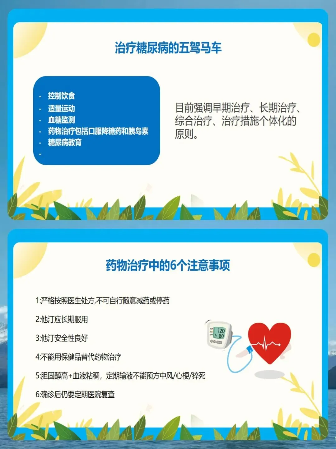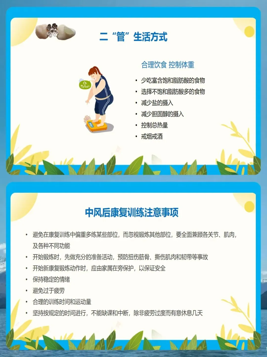 第二管,是管好生活方式。 我们要合理饮食,少吃富含饱和脂肪酸和高胆固醇的食物,多吃不饱和脂肪酸,减少盐的摄入,控制总热量,戒烟戒酒。同时,要保持乐观的心态。生病后容易焦虑,我们要多与家人、医生交流,保持心理平衡。