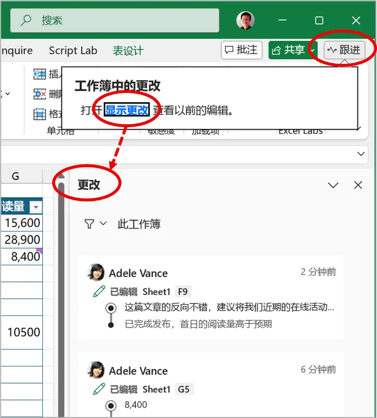 当你打开团队 Excel 工作簿后,为了快速掌握其他成员对其更新近况,执行【跟进】命令,并在弹出的提示框中执行【显示更改】命令,即可打开“更改”窗格。