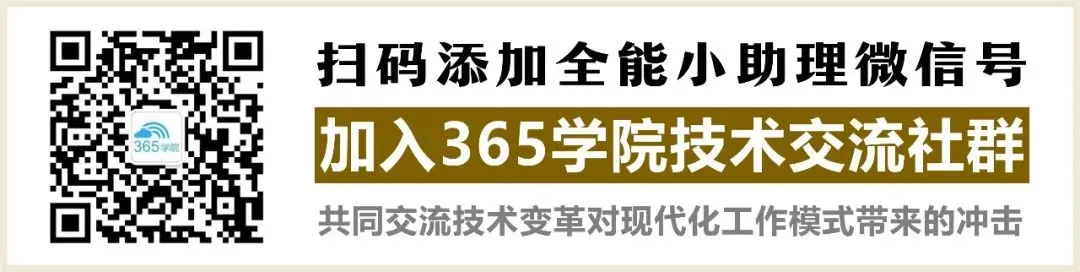 如果你希望与更多 Microsoft 365 企业用户、合作伙伴或技术专家讨论交流,请扫码添加“365学院小助理”微信号,我们将邀请你加入“365学院技术交流群”,共同探索 Microsoft 365 的应用场景和热点技术。期待你的加入!