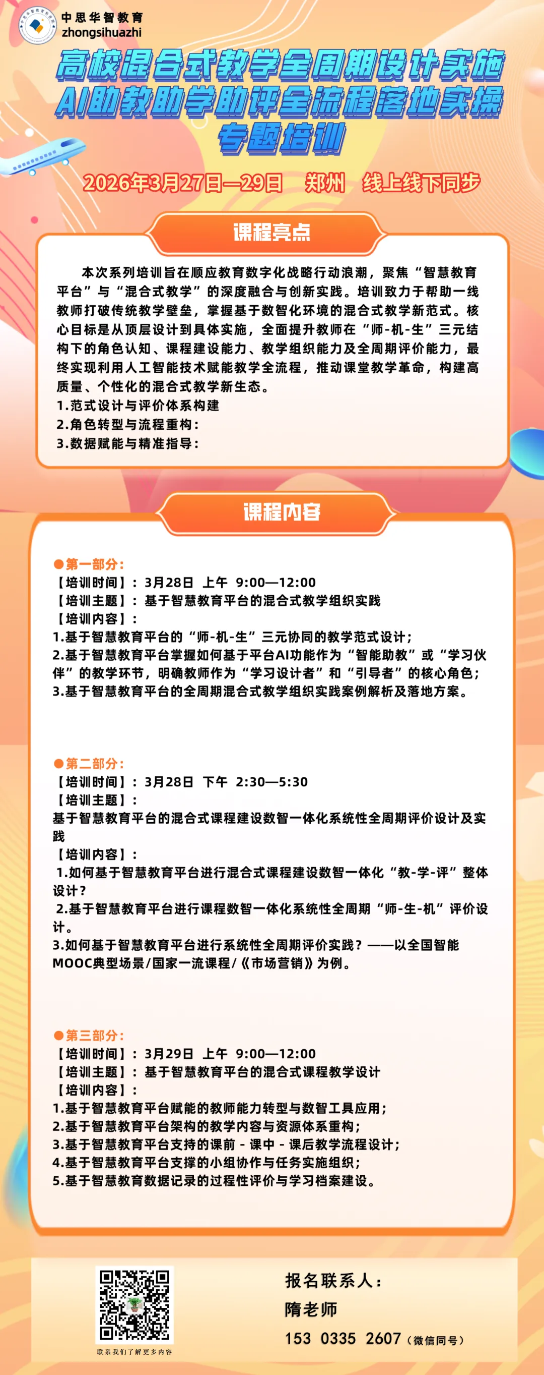 【3月27日—29日●郑州】以“数智赋能 评价重构”为主题的高校混合式教学全周期设计实施AI助教助学助评全流程落地实操专题培训