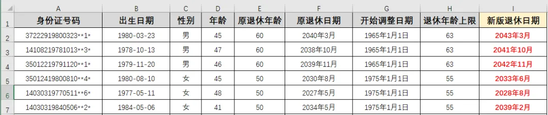 如何根据身份证号码、或是出生日期,计算延退后的退休日期:出生日期:=TEXT(MID(A2,7,8),"0000-00-00")性别:=IF(MOD(MID(A2,17,1),2)=0,"女","男")年龄:=DATEDIF(B2,TODAY(),"Y")原退休年龄:男60岁,女50岁(女干部55岁——公务员才有,这里先忽略,只计算简化情况)原退休日期:按原来退休年龄(女50岁、男60岁)对应的退休日期公式:=EOMONTH(B2,E2*12-1)+1开始调整日期:2025-1-1起,男退休年龄每4个月延迟1月,女退休年龄每2个月延迟1月公式:=EOMONTH("2025/1/1",-E2*12-1)+1公式:=EOMONTH(F2,MIN((H2-E2)*12-1,INT(DATEDIF(G2,B2,"m") /IF(D2<55,2,4))))+1