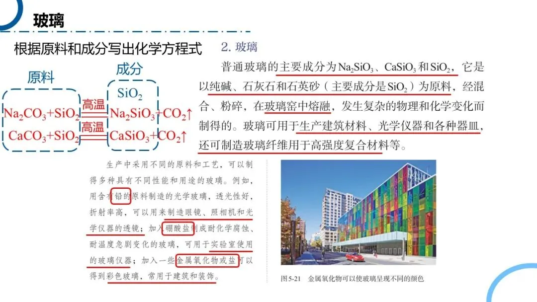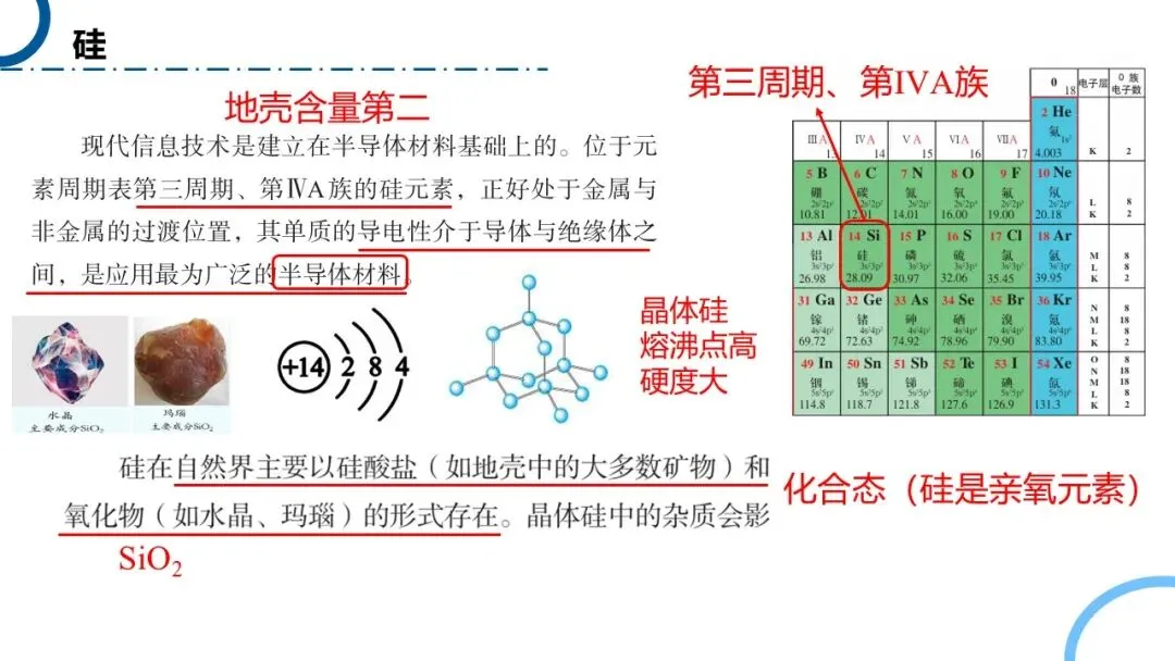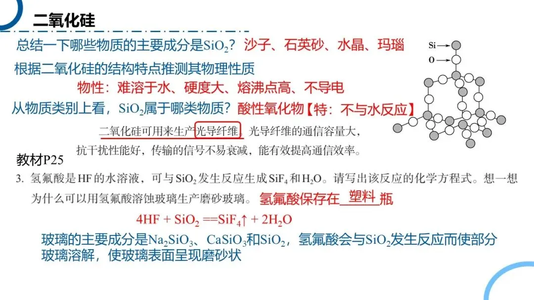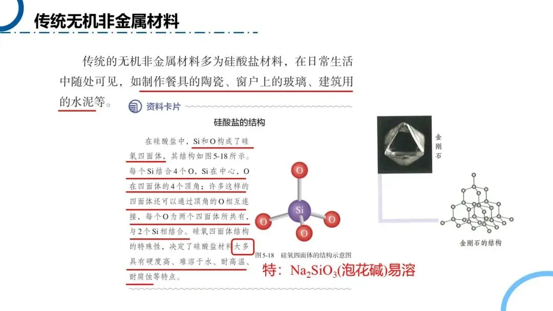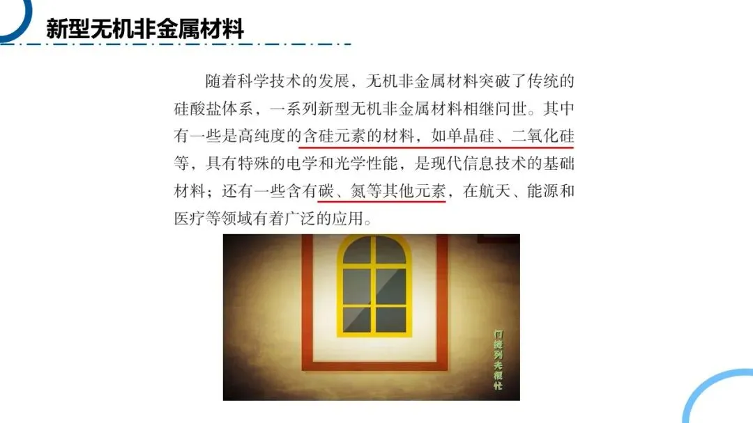 这一节学习材料的分类,三种传统无机非金属材料(陶瓷玻璃水泥),新型无机非金属材料,重点学习了硅、二氧化硅的性质和用途,补充了解硅酸钠、硅酸的性质,了解新型陶瓷和碳纳米材料。