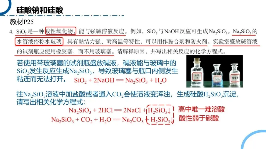 借助教材的练习,了解硅酸钠的性质特点,了解硅酸的性质。