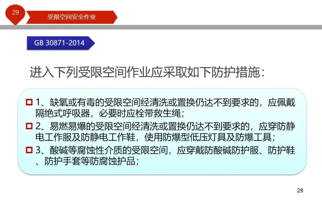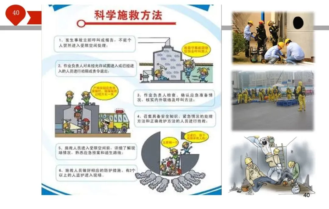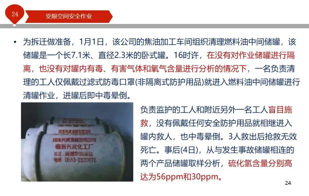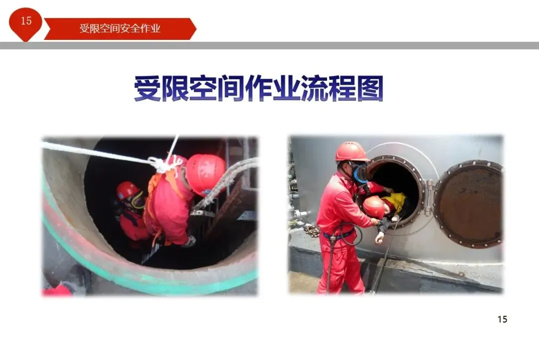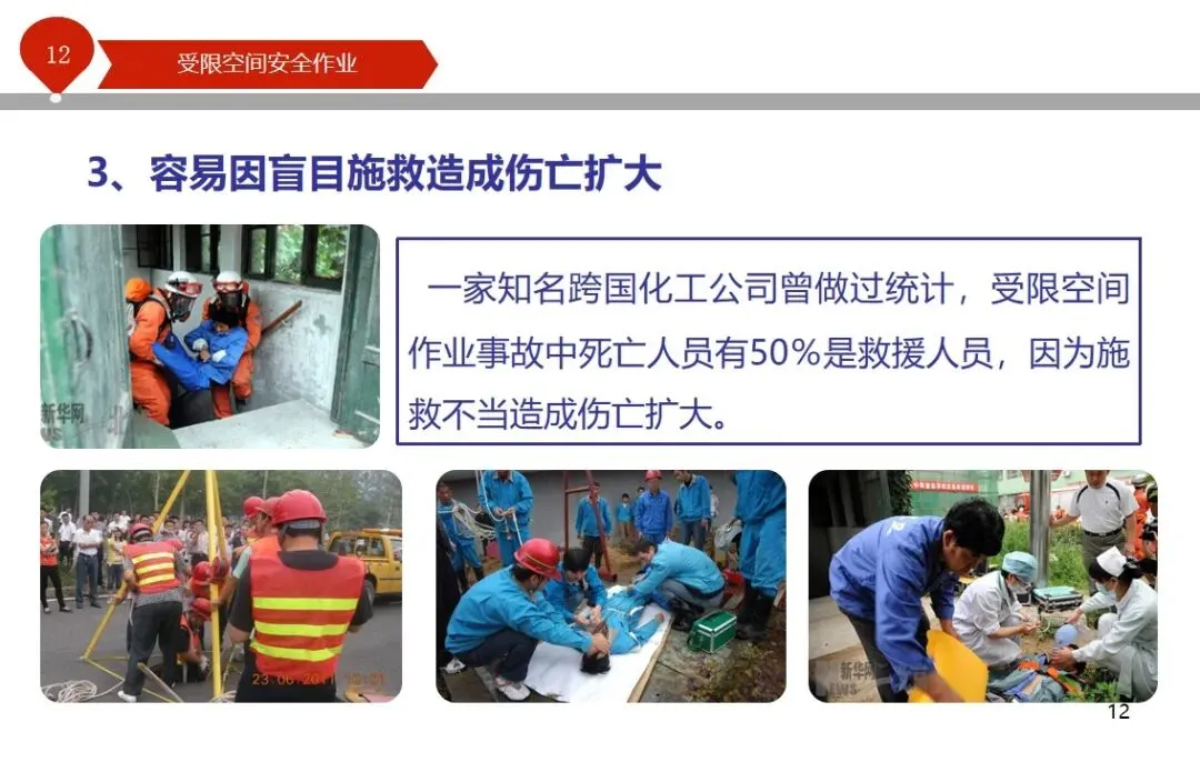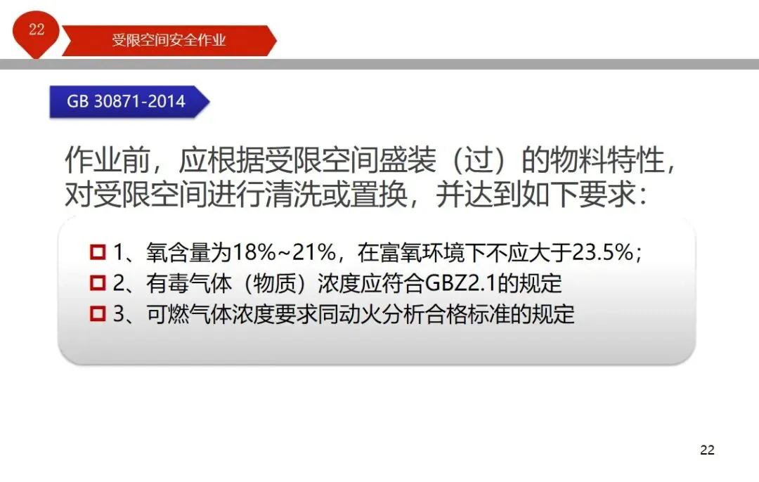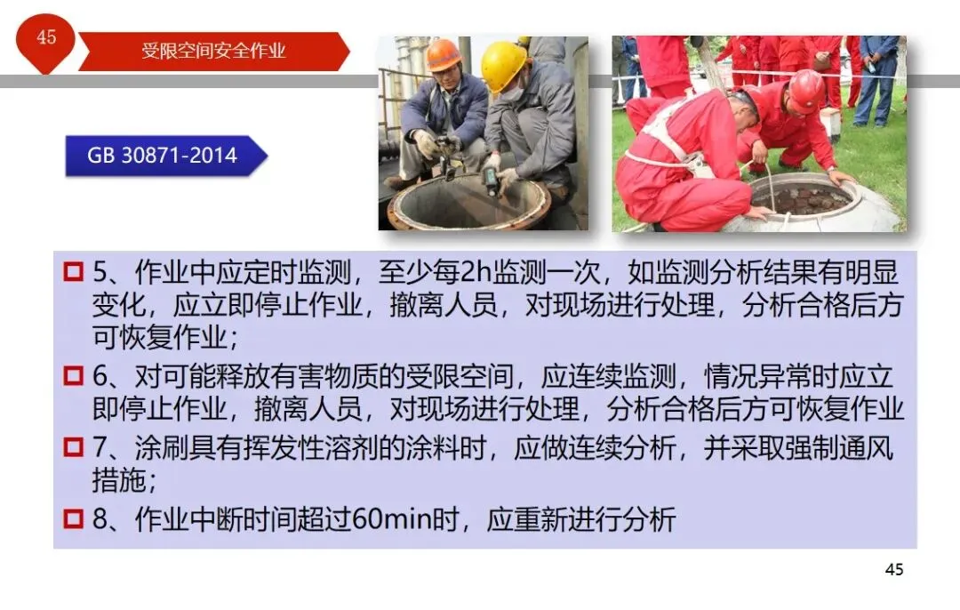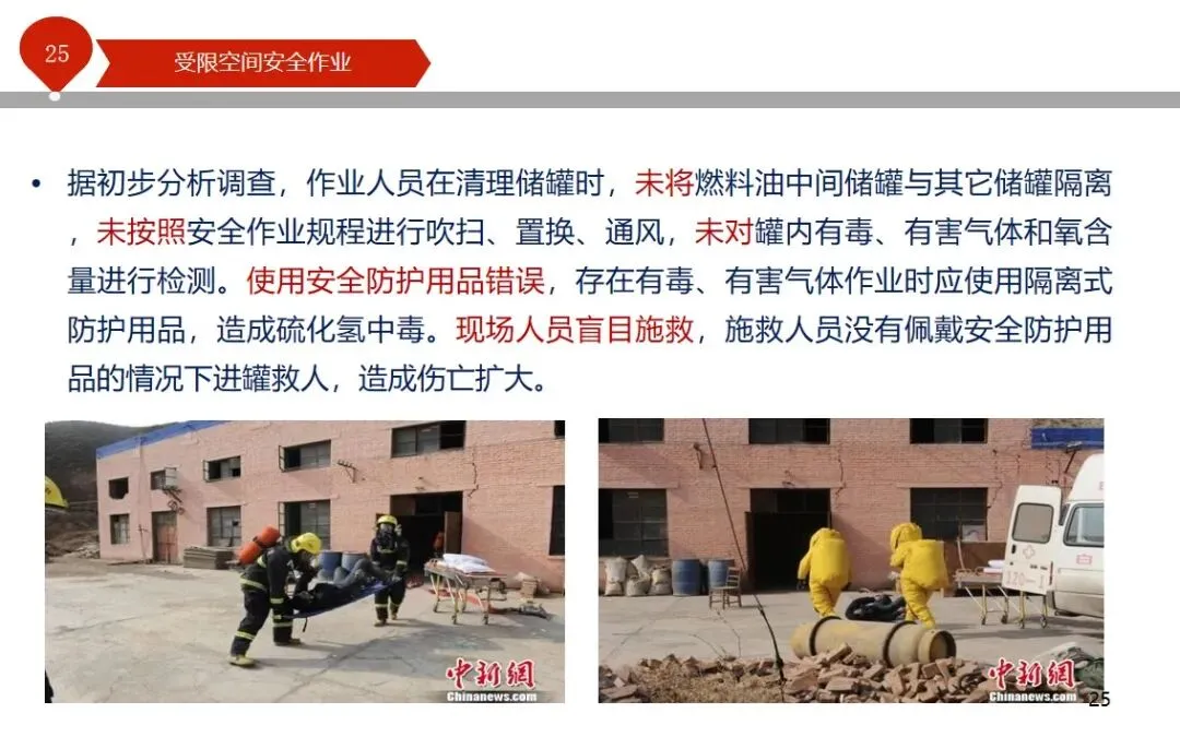 报告结合多起典型案例强调风险防控要点。有限空间广泛存在于化工、冶金、污水处理等多个行业,作业环境复杂,通风不畅且易积聚有毒有害气体,存在中毒、窒息、燃爆等多重风险,盲目施救易导致风险扩大。培训明确作业核心流程,需先履行审批手续,制定包含安全隔绝、清洗置换、通风照明等措施的作业方案。作业前 30 分钟内须完成气体检测,氧含量需控制在 18%-21%,有毒有害与可燃气体浓度需符合国家标准。作业人员需按场景佩戴隔绝式呼吸器等防护用品,受限空间外必须配备专职监护人员,保持实时联络。PPT 着重强调应急保障要求,需配备通讯、检测、救援等装备,制定科学施救预案并开展演练。作业全程需严格遵循 GB 30871-2014 标准,作业证有效期不超过 24 小时,变更作业内容需重新审批,确保全流程安全可控。