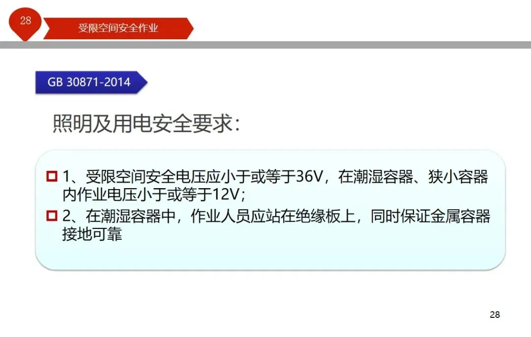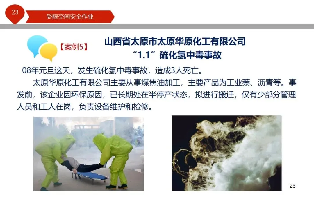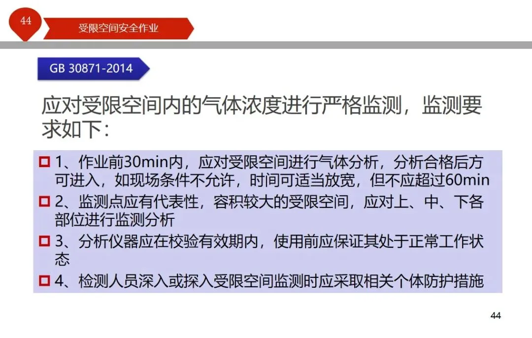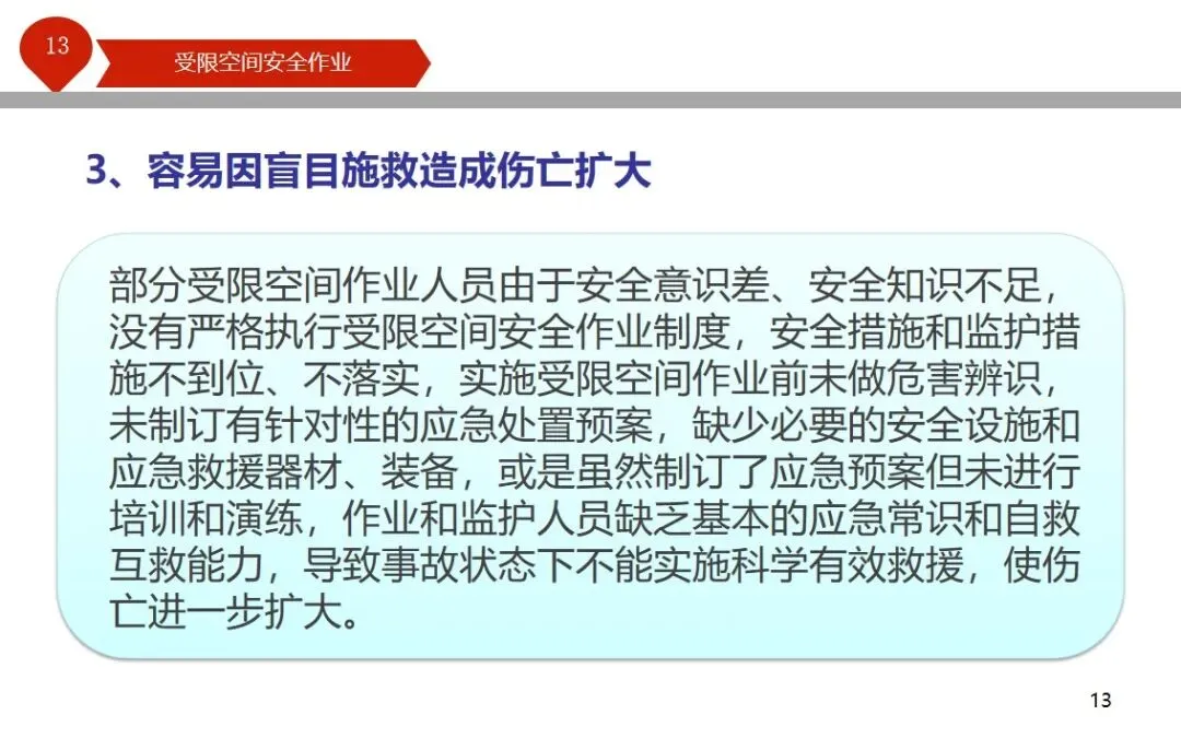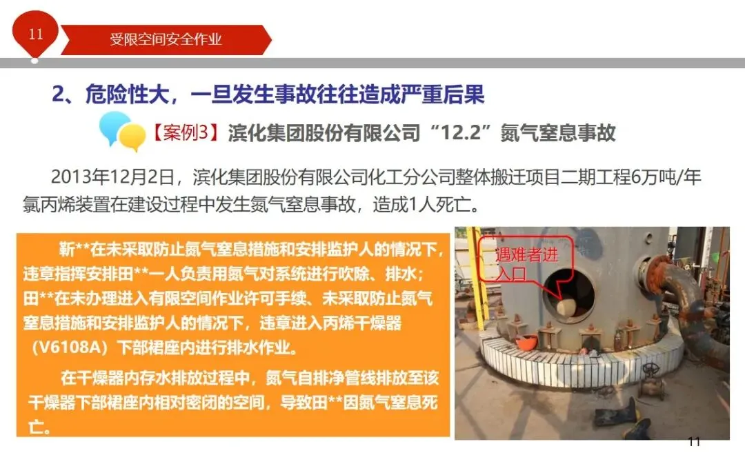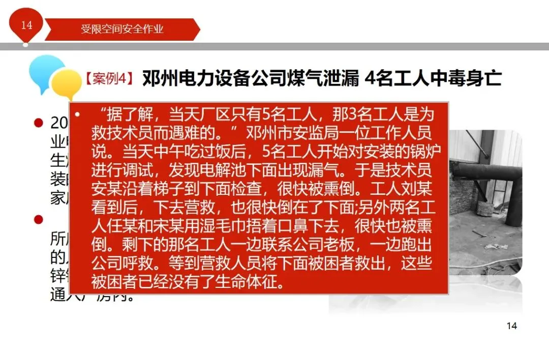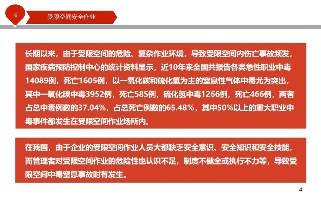报告结合多起典型案例强调风险防控要点。有限空间广泛存在于化工、冶金、污水处理等多个行业,作业环境复杂,通风不畅且易积聚有毒有害气体,存在中毒、窒息、燃爆等多重风险,盲目施救易导致风险扩大。培训明确作业核心流程,需先履行审批手续,制定包含安全隔绝、清洗置换、通风照明等措施的作业方案。作业前 30 分钟内须完成气体检测,氧含量需控制在 18%-21%,有毒有害与可燃气体浓度需符合国家标准。作业人员需按场景佩戴隔绝式呼吸器等防护用品,受限空间外必须配备专职监护人员,保持实时联络。PPT 着重强调应急保障要求,需配备通讯、检测、救援等装备,制定科学施救预案并开展演练。作业全程需严格遵循 GB 30871-2014 标准,作业证有效期不超过 24 小时,变更作业内容需重新审批,确保全流程安全可控。