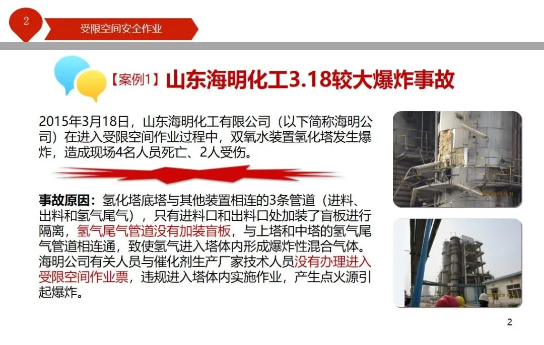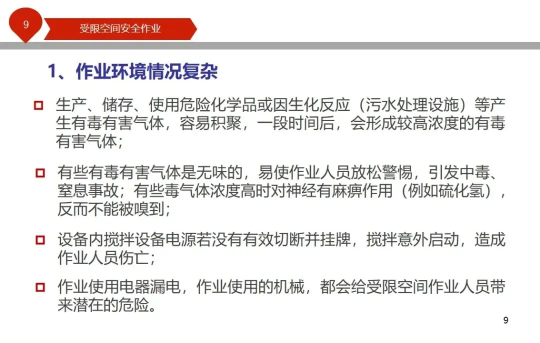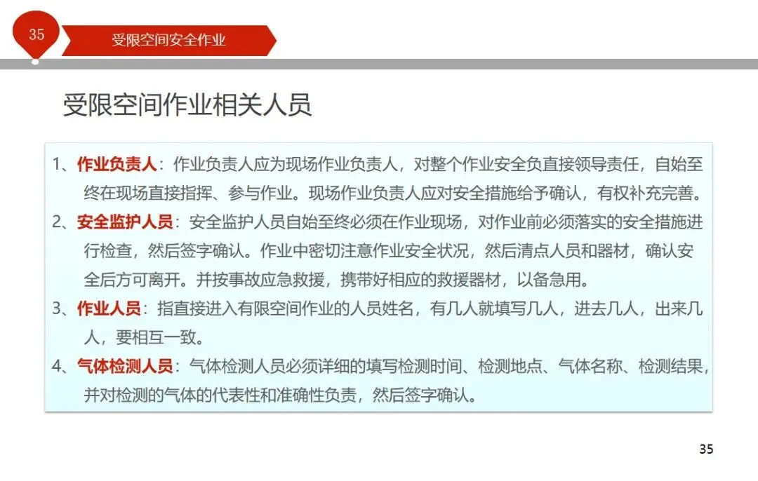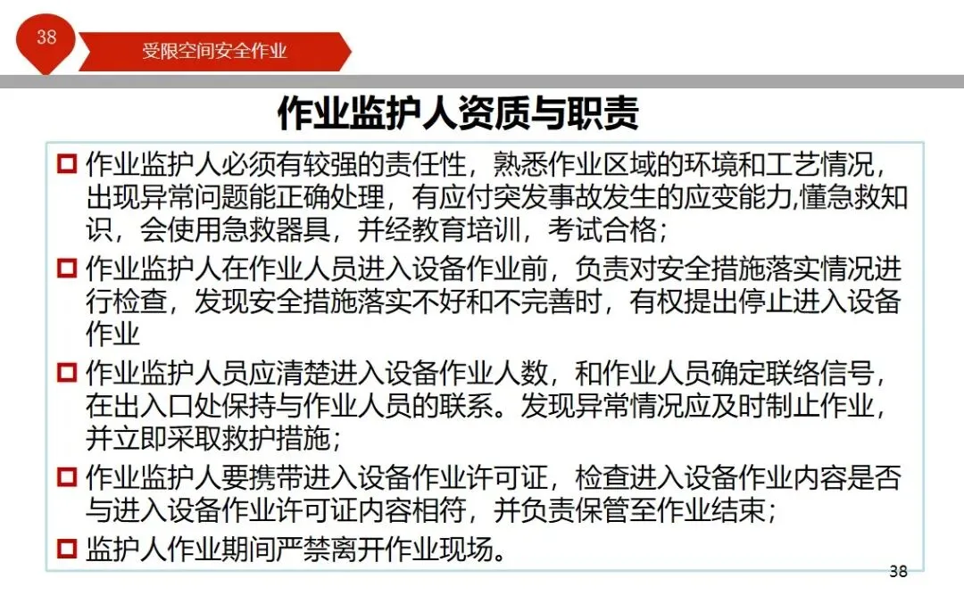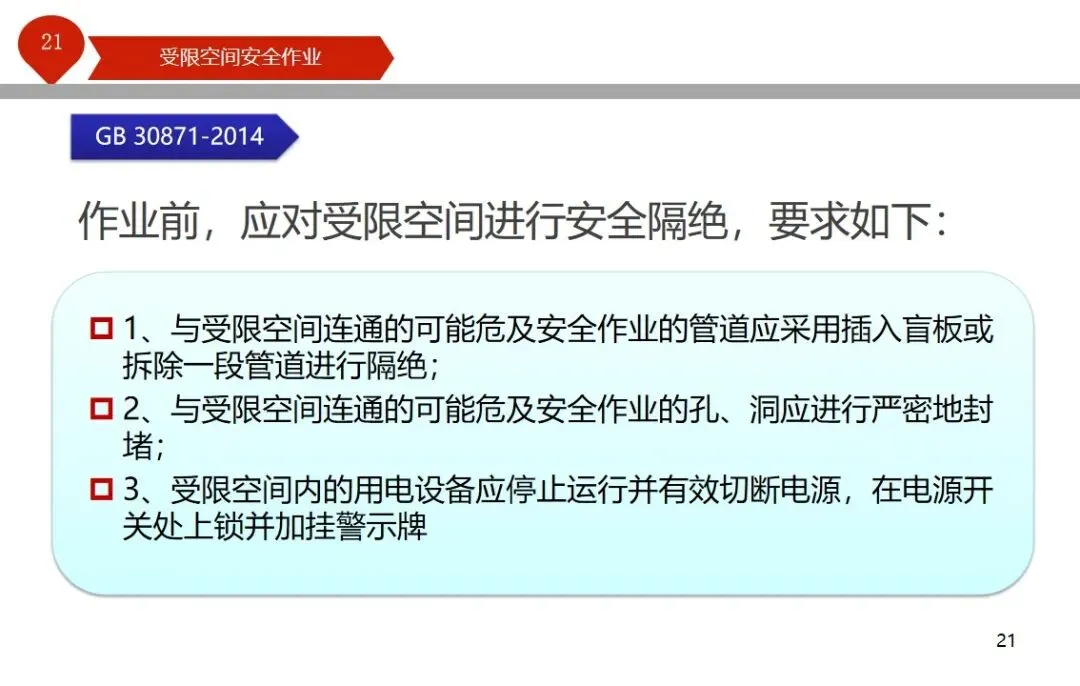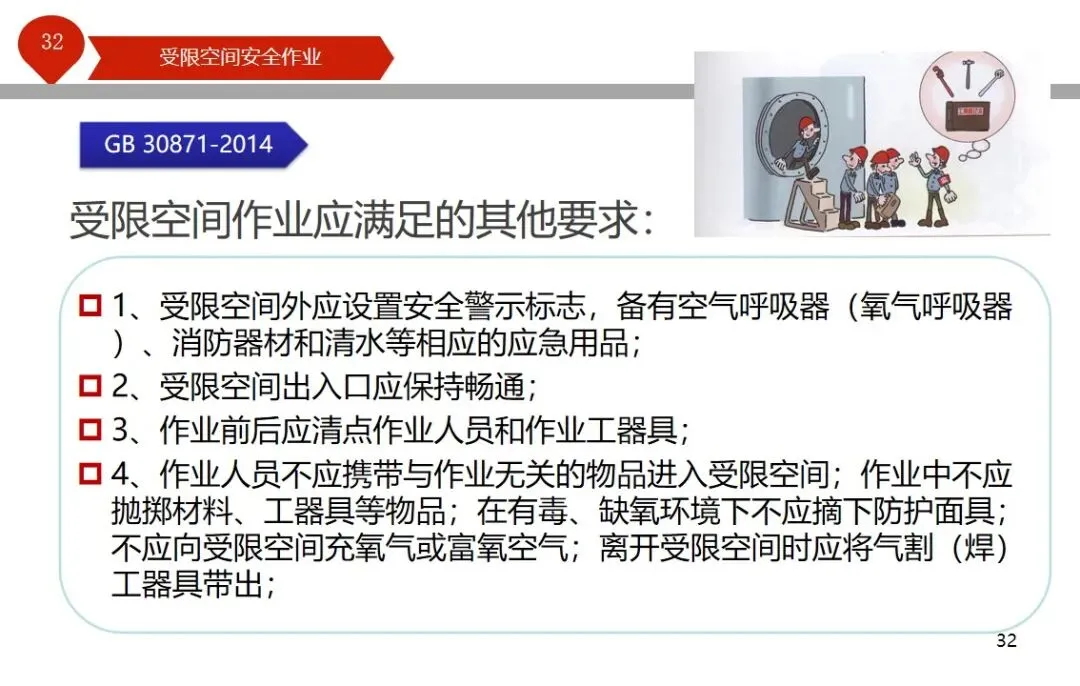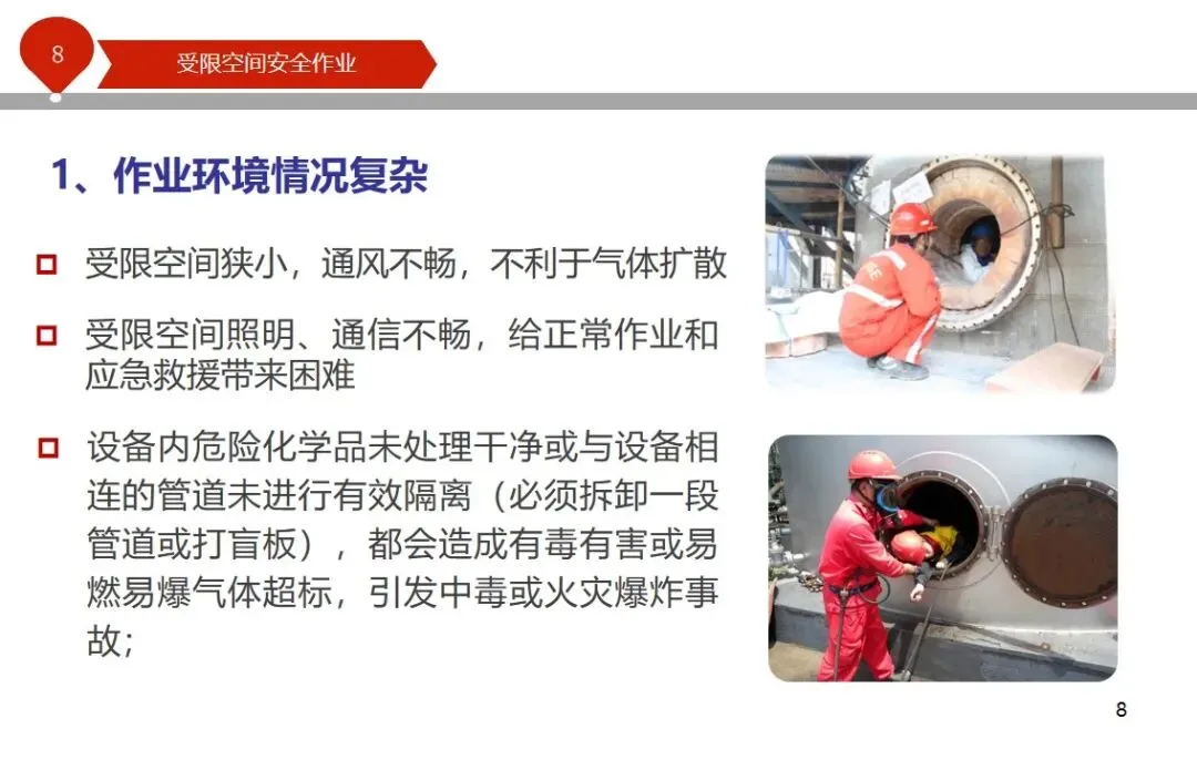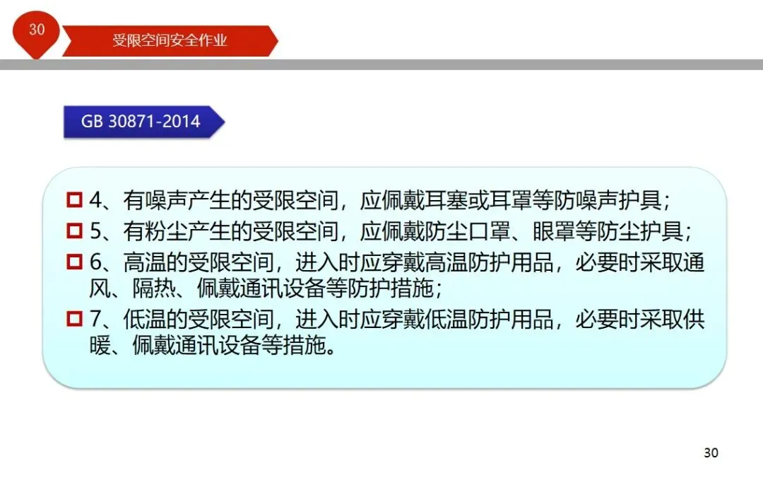 报告结合多起典型案例强调风险防控要点。有限空间广泛存在于化工、冶金、污水处理等多个行业,作业环境复杂,通风不畅且易积聚有毒有害气体,存在中毒、窒息、燃爆等多重风险,盲目施救易导致风险扩大。培训明确作业核心流程,需先履行审批手续,制定包含安全隔绝、清洗置换、通风照明等措施的作业方案。作业前 30 分钟内须完成气体检测,氧含量需控制在 18%-21%,有毒有害与可燃气体浓度需符合国家标准。作业人员需按场景佩戴隔绝式呼吸器等防护用品,受限空间外必须配备专职监护人员,保持实时联络。PPT 着重强调应急保障要求,需配备通讯、检测、救援等装备,制定科学施救预案并开展演练。作业全程需严格遵循 GB 30871-2014 标准,作业证有效期不超过 24 小时,变更作业内容需重新审批,确保全流程安全可控。