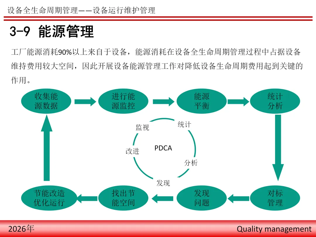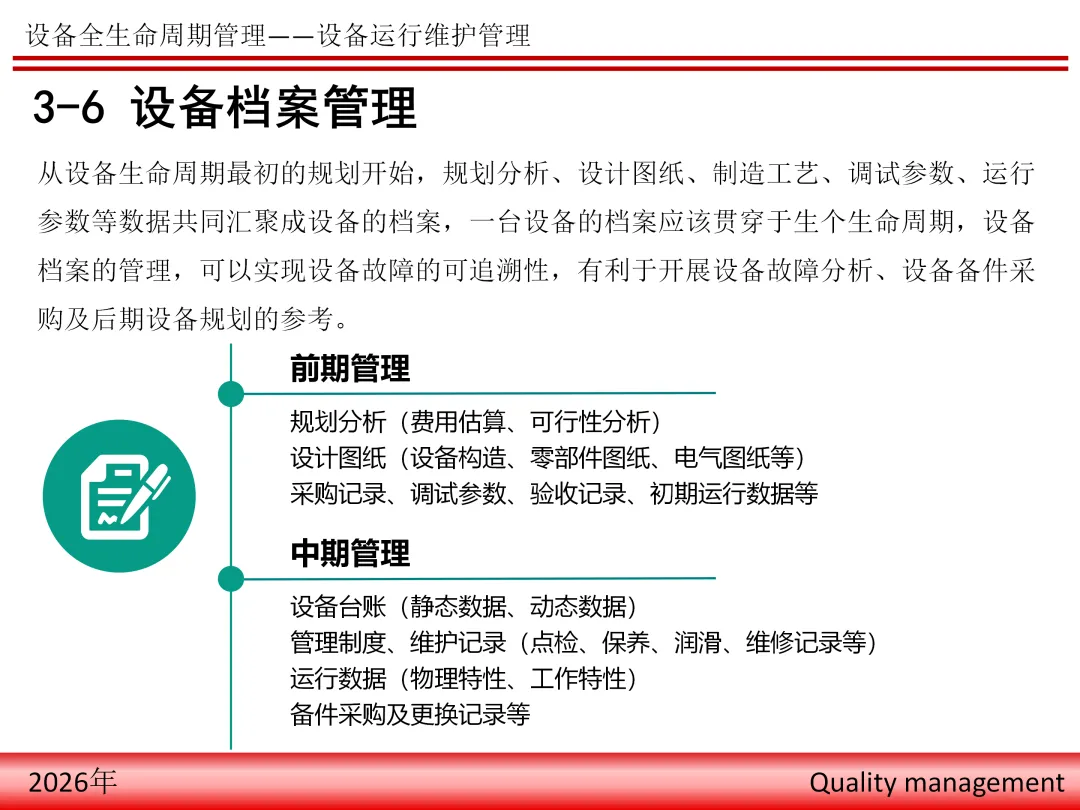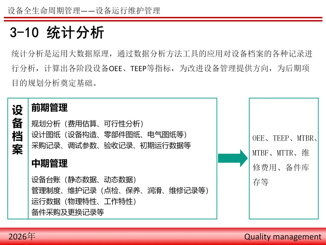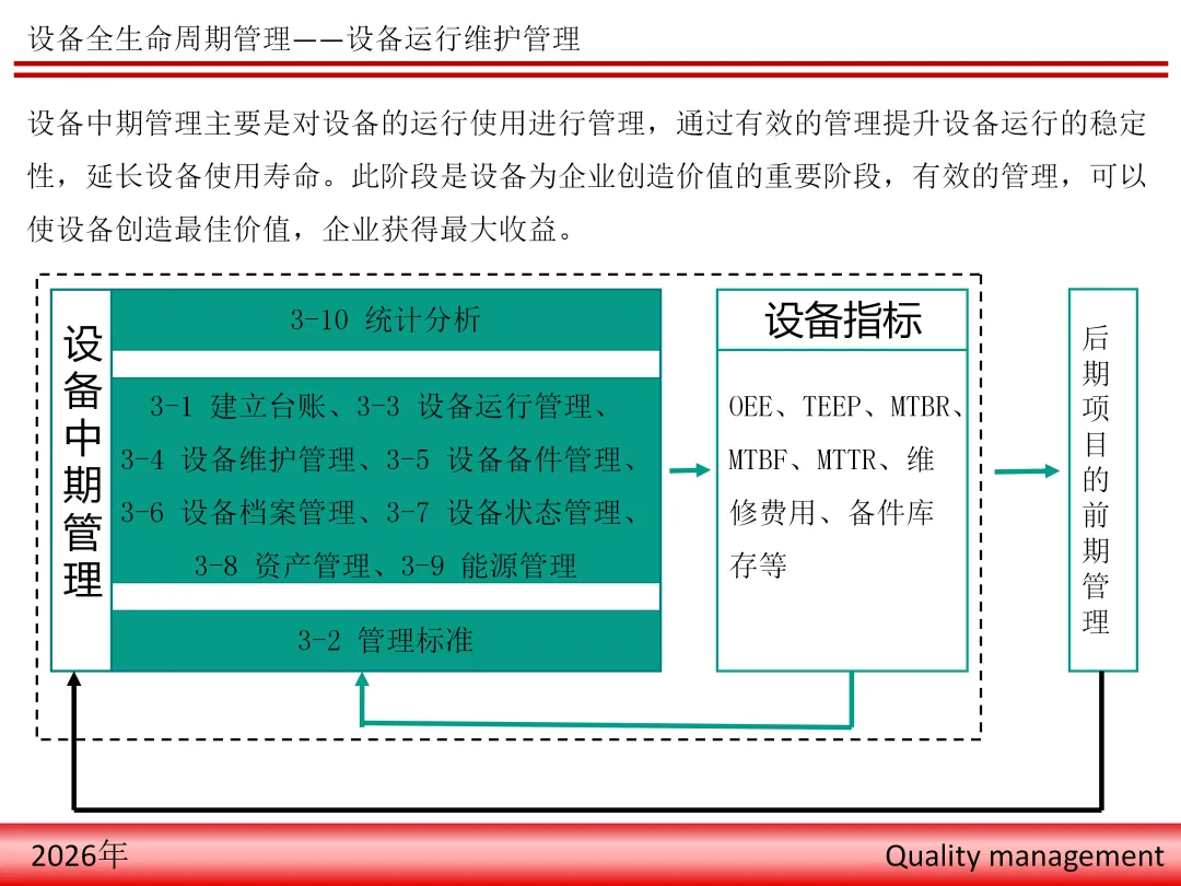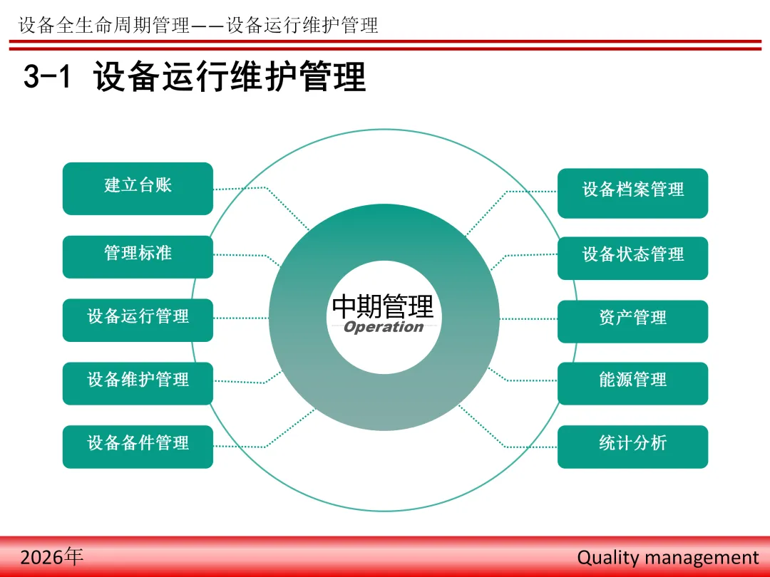中期,要围绕台账、标准、运行、维护、备件、档案、能源和统计分析展开,让设备始终处于受控状态。